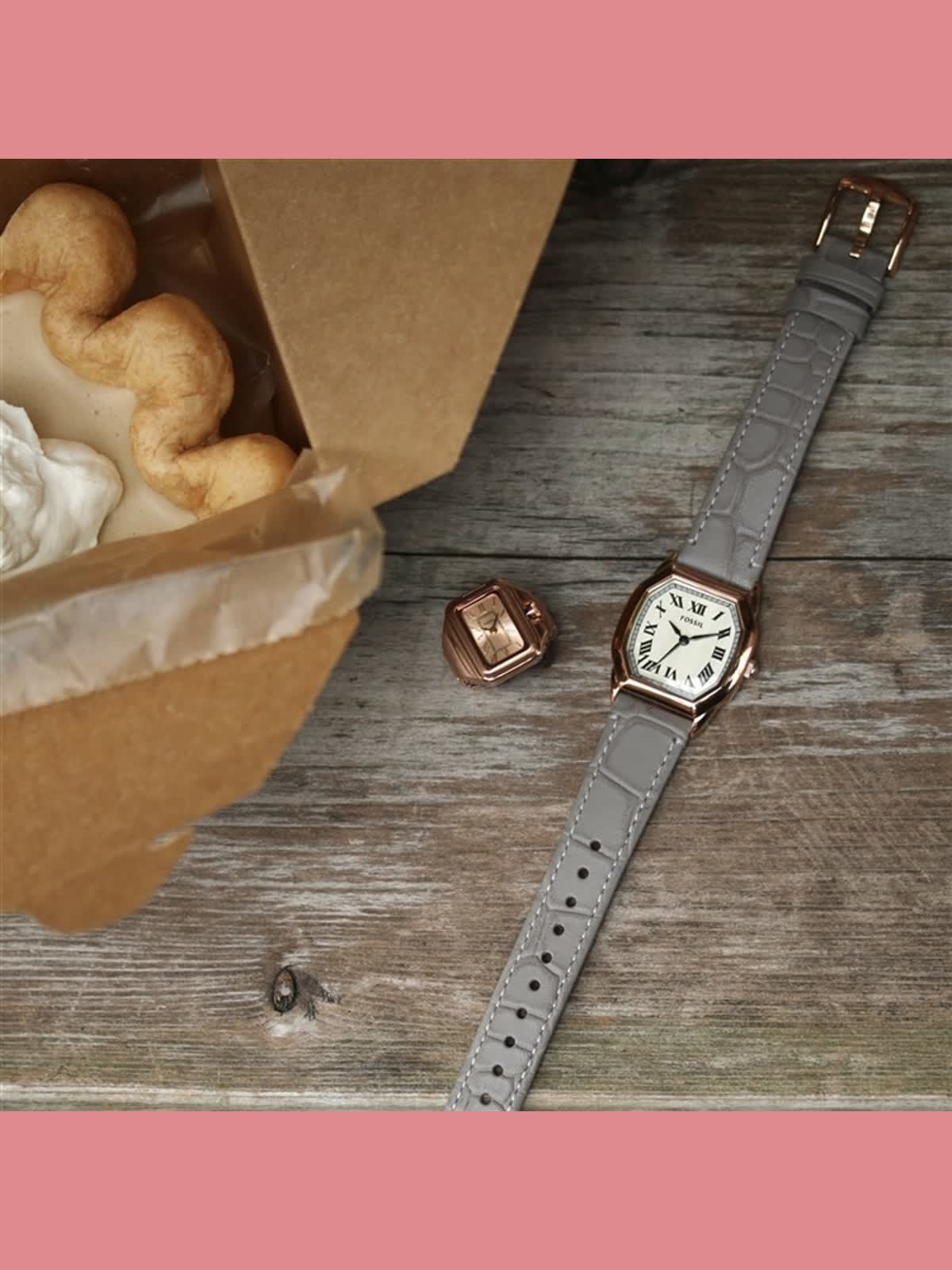 ローズゴールドトーンの八角形ケースがこのウォッチの洗練されたベースを作り、クリーム色の質感のあるダイヤルが深みを添えています。グレーのクロコレザーストラップが、モダンで控えめな手触りの仕上げでデザインを引き立てています。