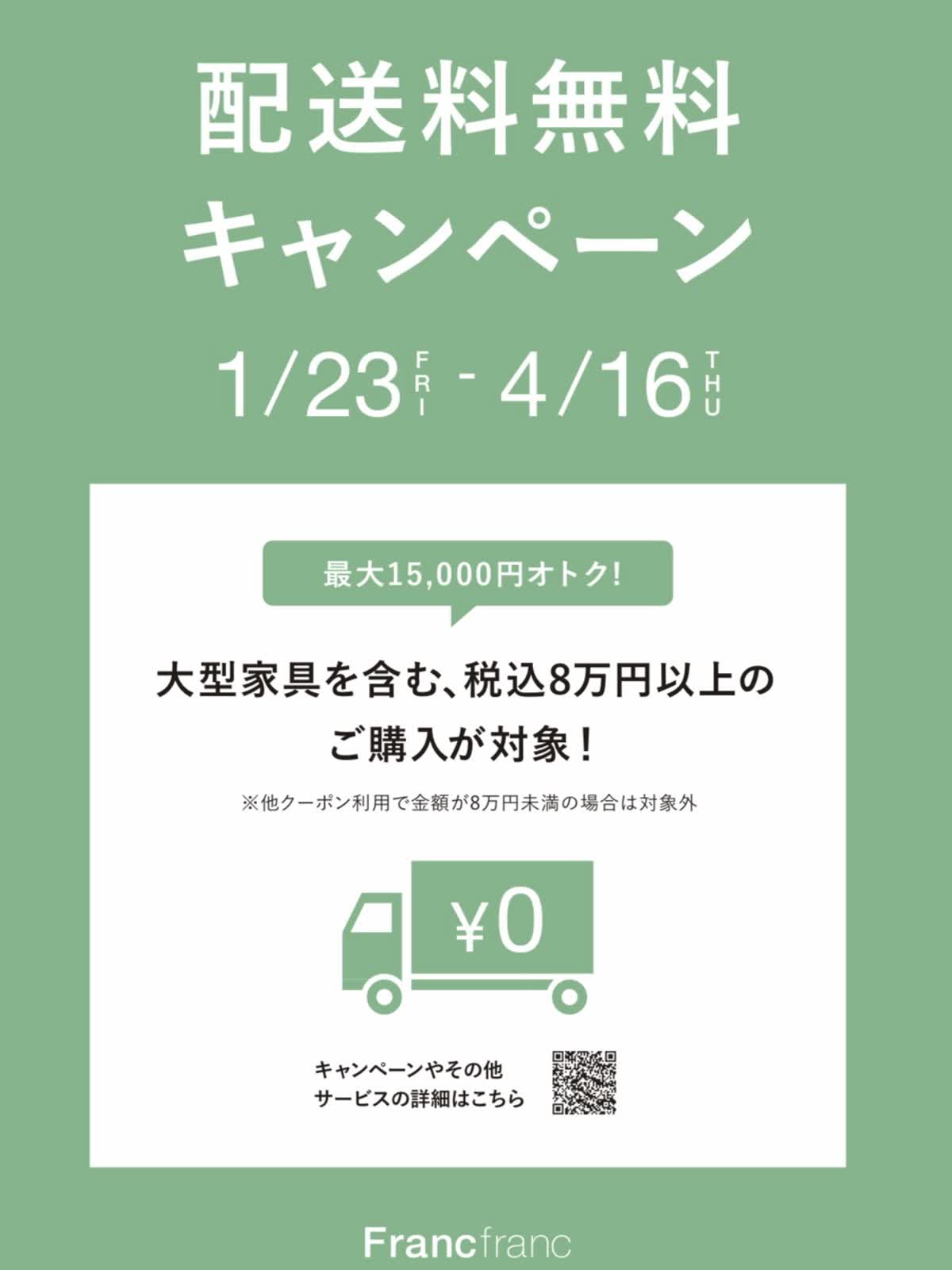 ルクア 8F フランフラン \🚚配送料無料キャンペーン🚚/ 家具を含む合計8万円以上のご購入で配送料が無料!! 1月23日(金)から、まとめ買いがお得な配送料無料キャンペーンが始まります📣 春の新生活や模様替えに向けて、ぜひこの機会にFrancfrancの家具や雑貨をお買い求めください💁♀️ ショップニュース⼀覧