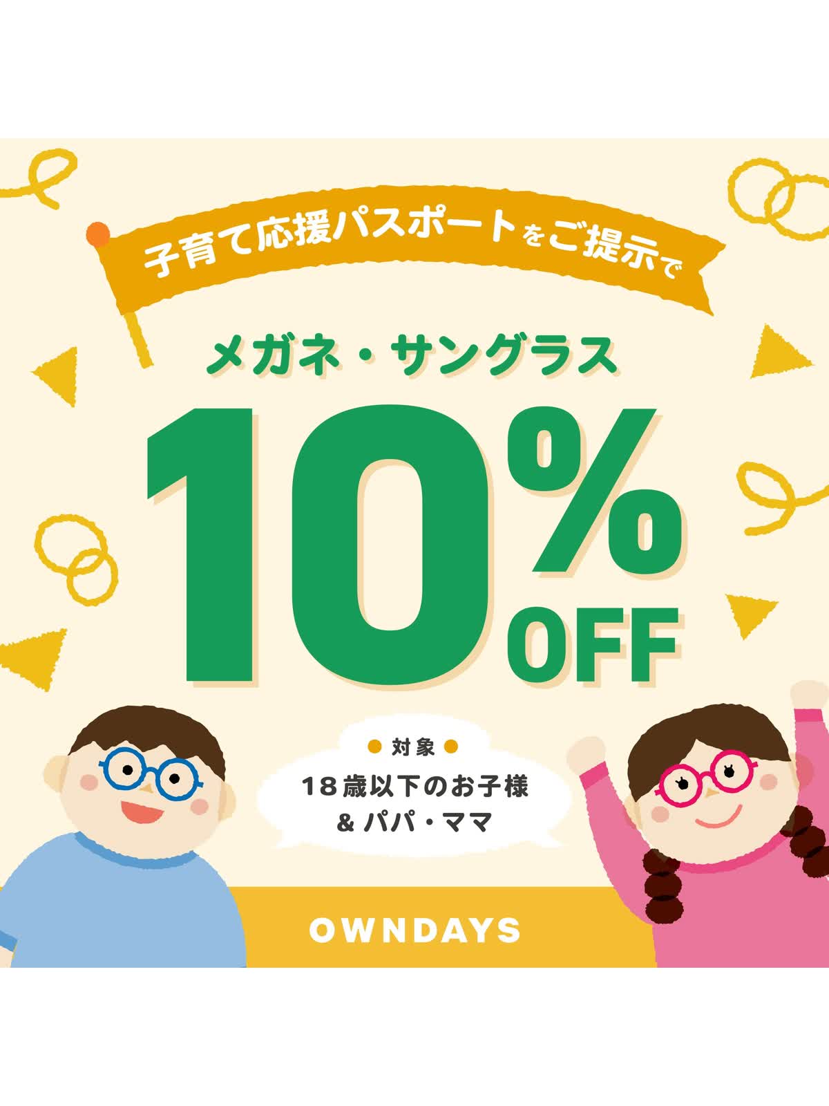 OWNDAYSでは、日々子育てに奮闘されているパパ・ママ、そして成長期のお子様を応援するキャン ペーンを通年実施しております。 お会計時に各自治体の「子育て応援パスポート」をご提示いただくと、お 好きなメガネ・サングラスが10%OFFにてお求めいただけます!