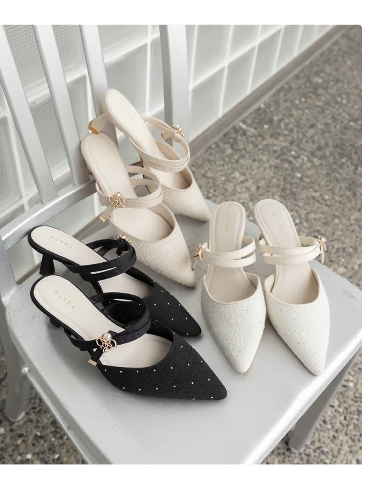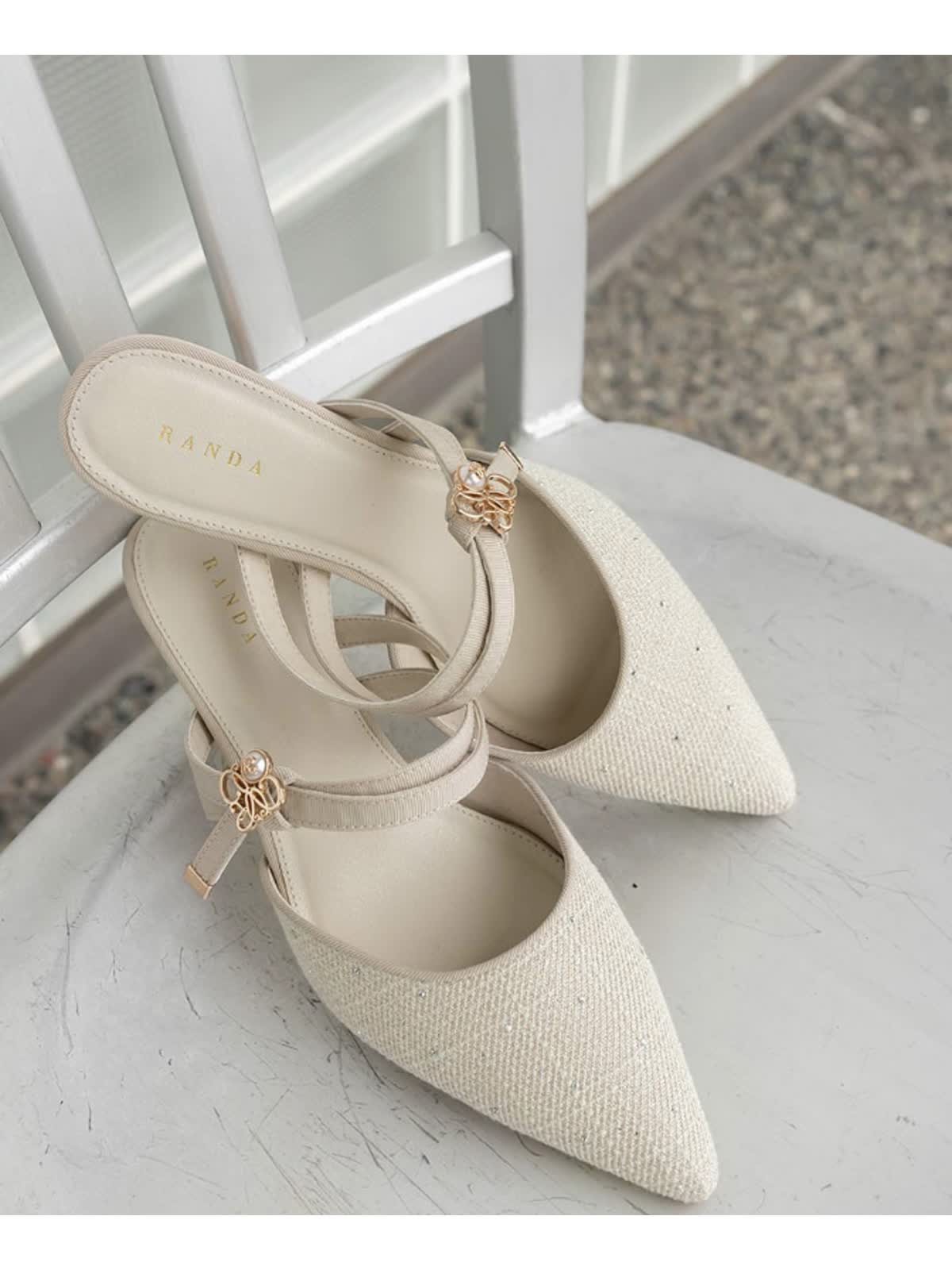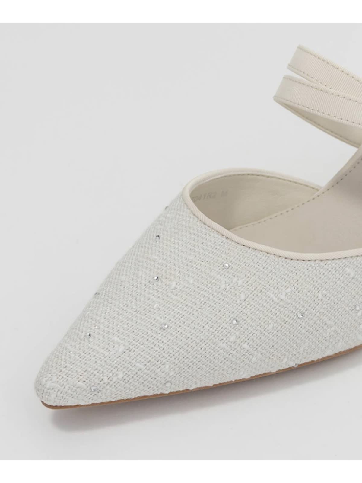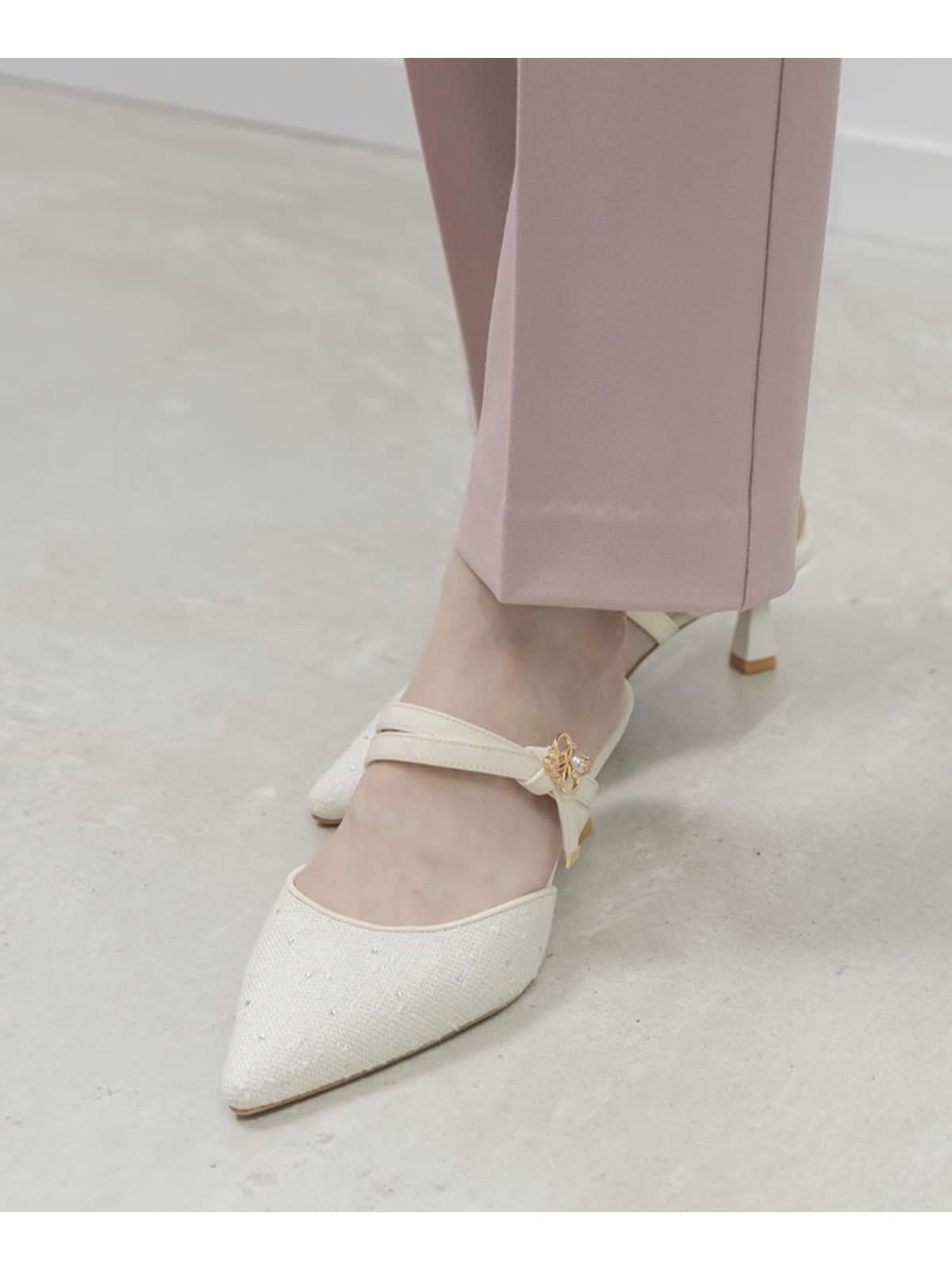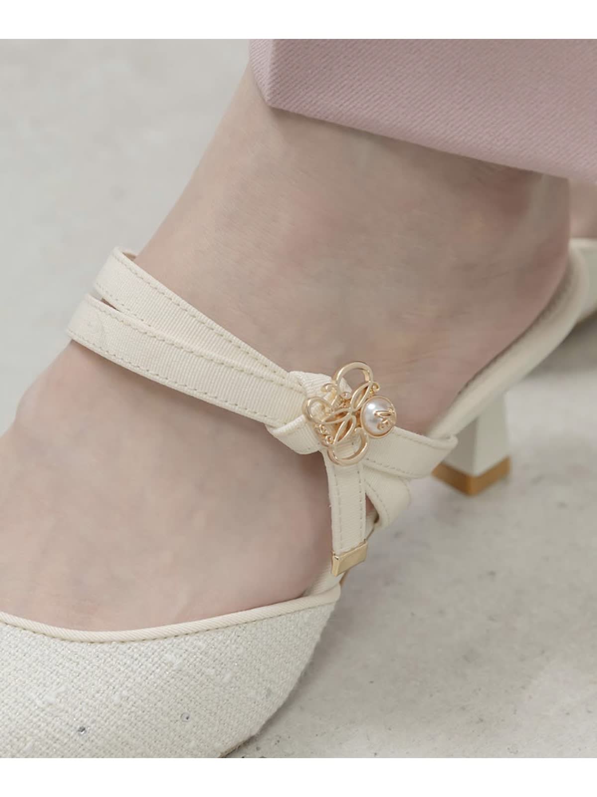 上品なモノグラムパールがポイントのミュールパンプス。