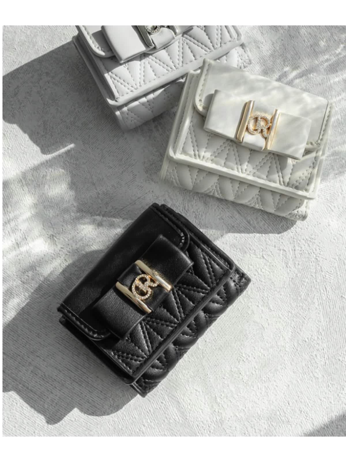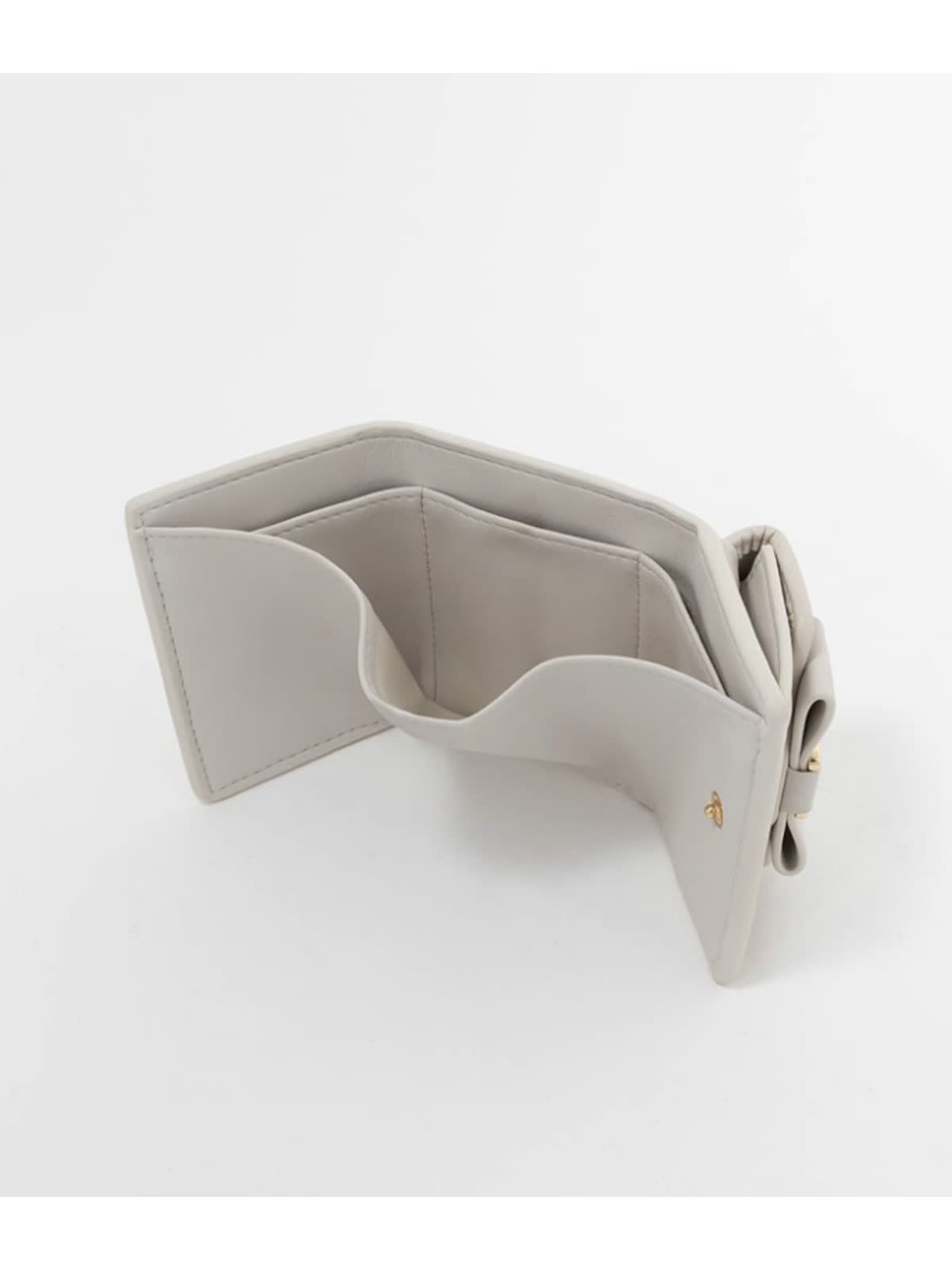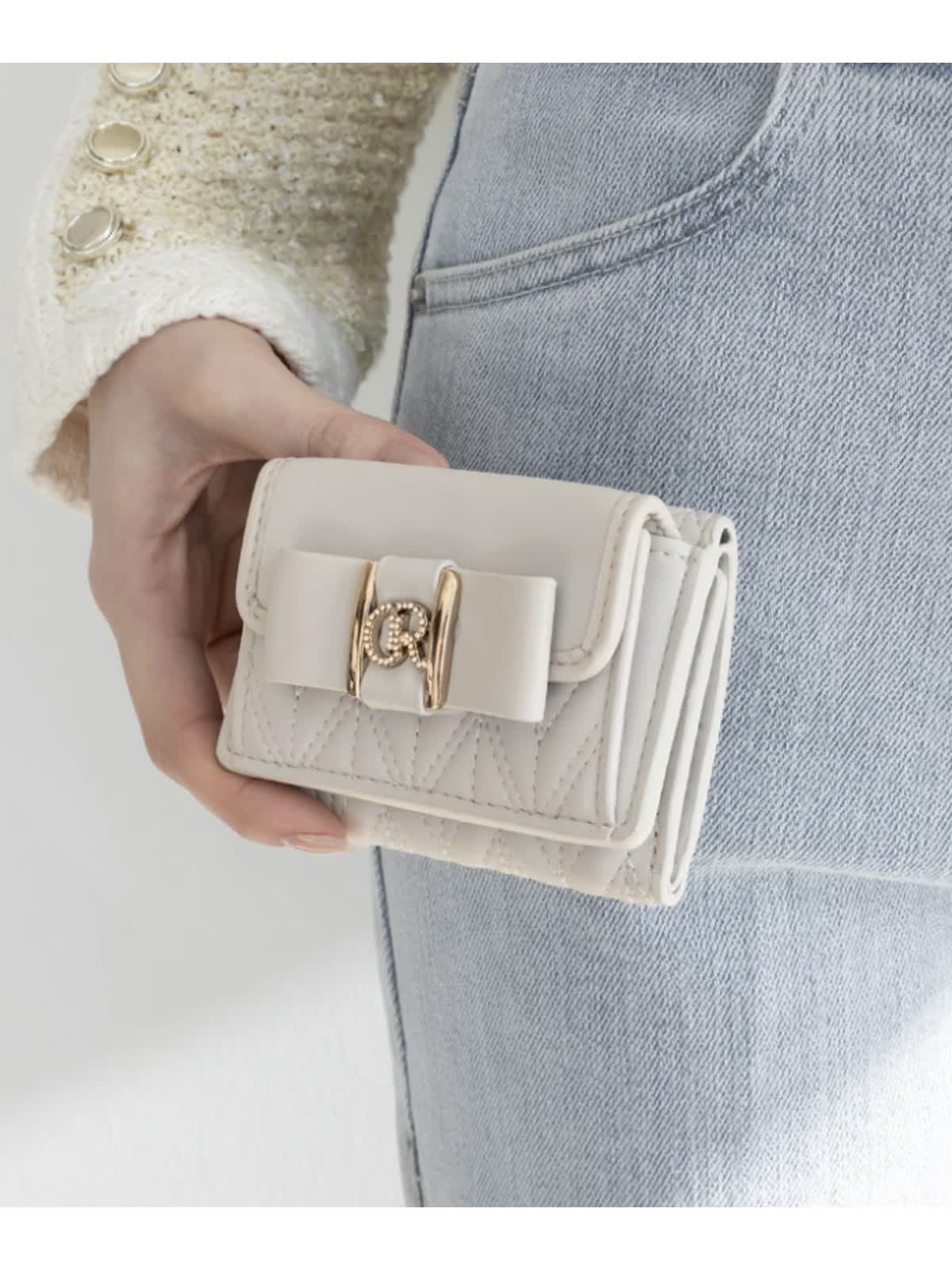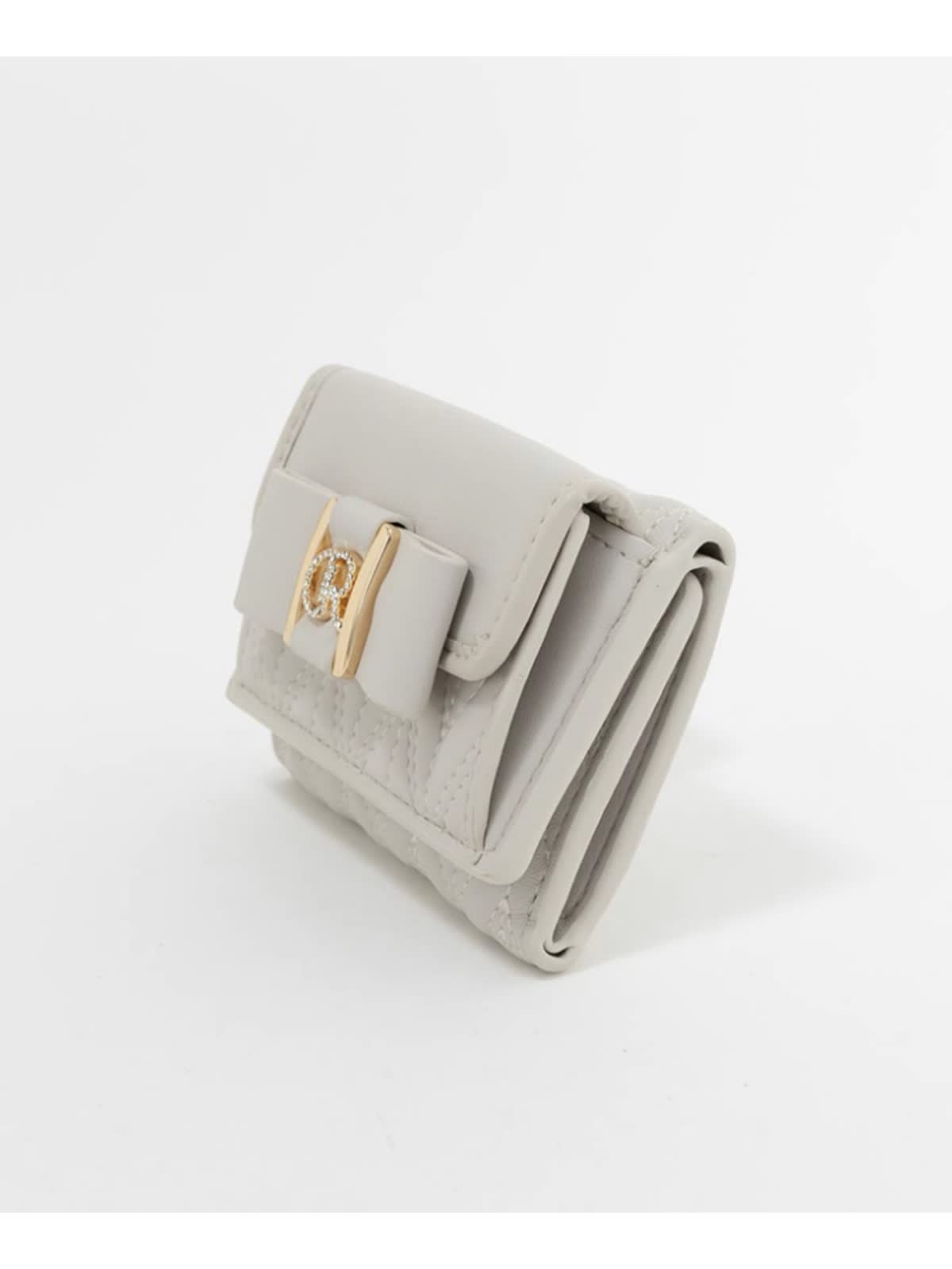 ビジューをあしらったモノグラムリボンが上品なキルティング三つ折り財布。