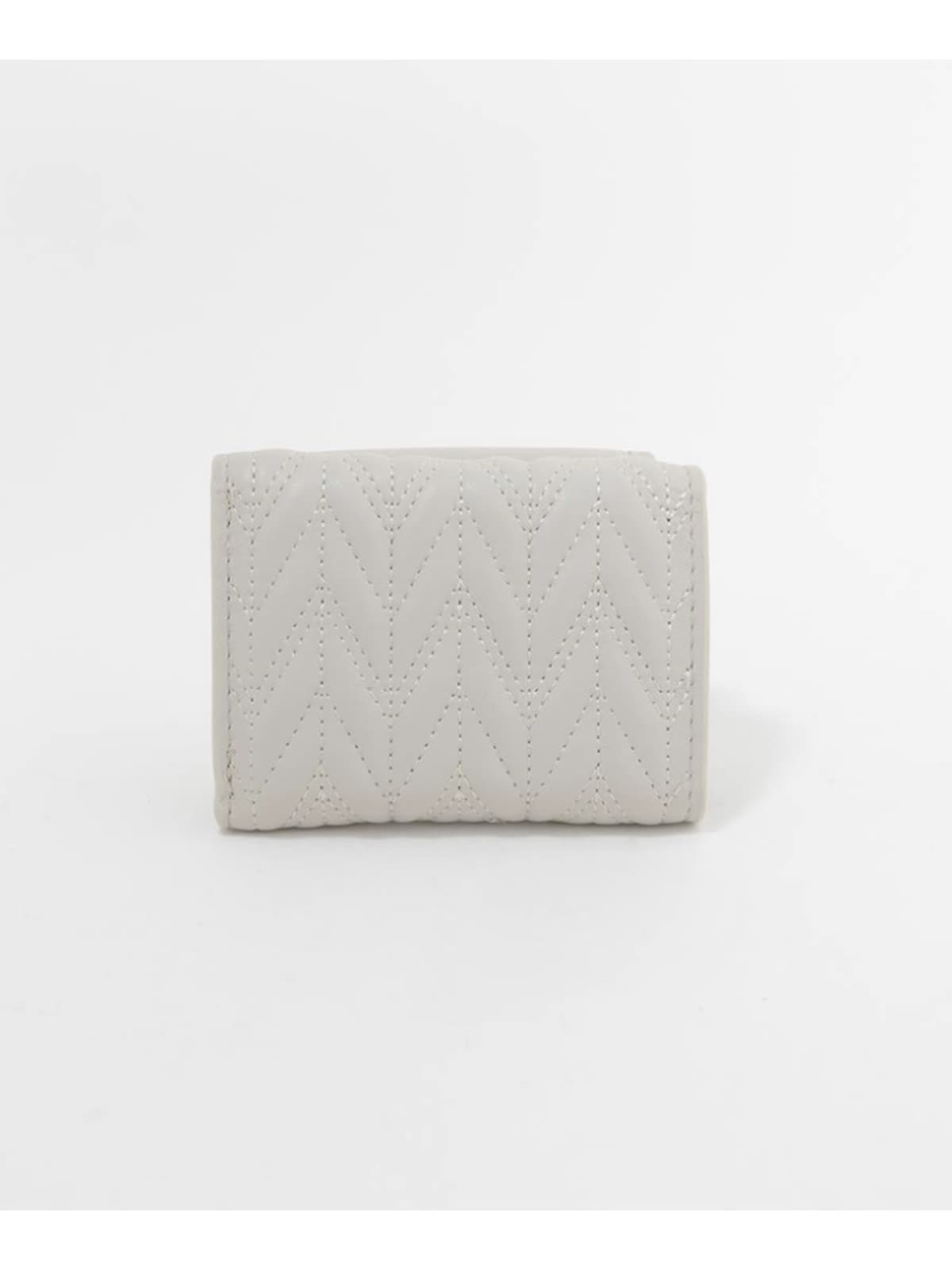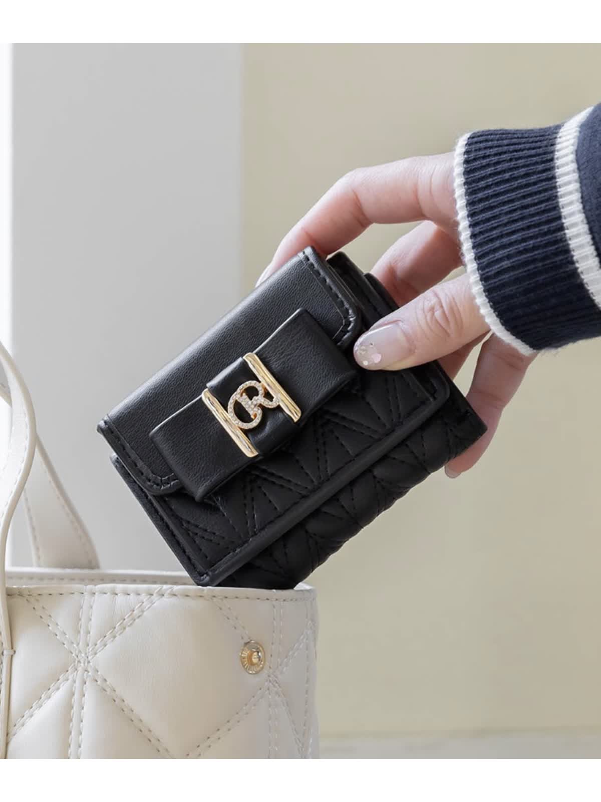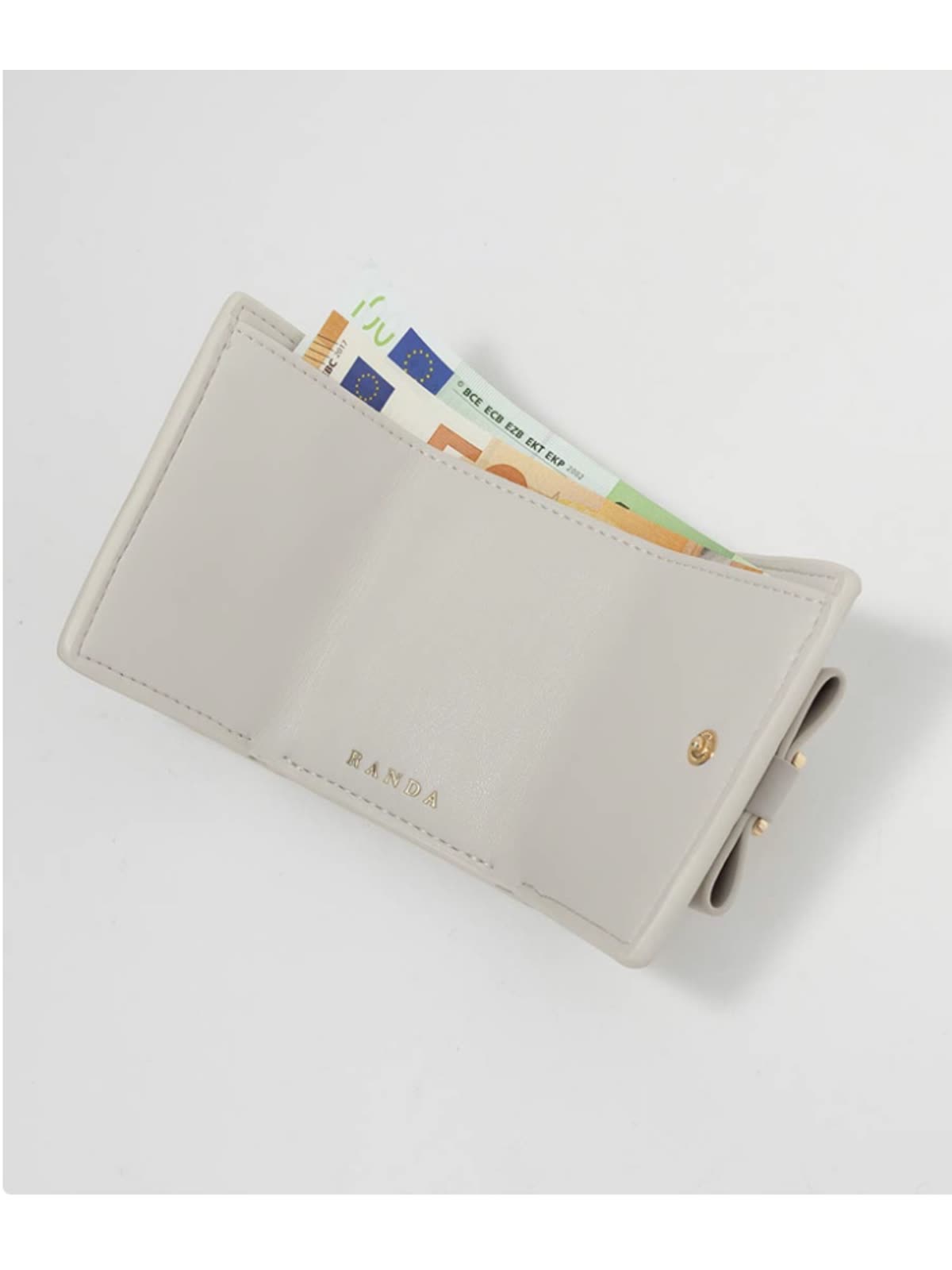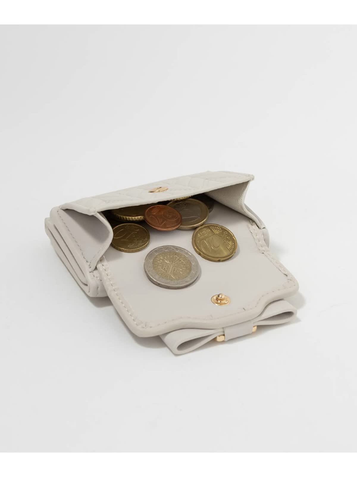 ビジューをあしらったモノグラムリボンが上品なキルティング三つ折り財布。