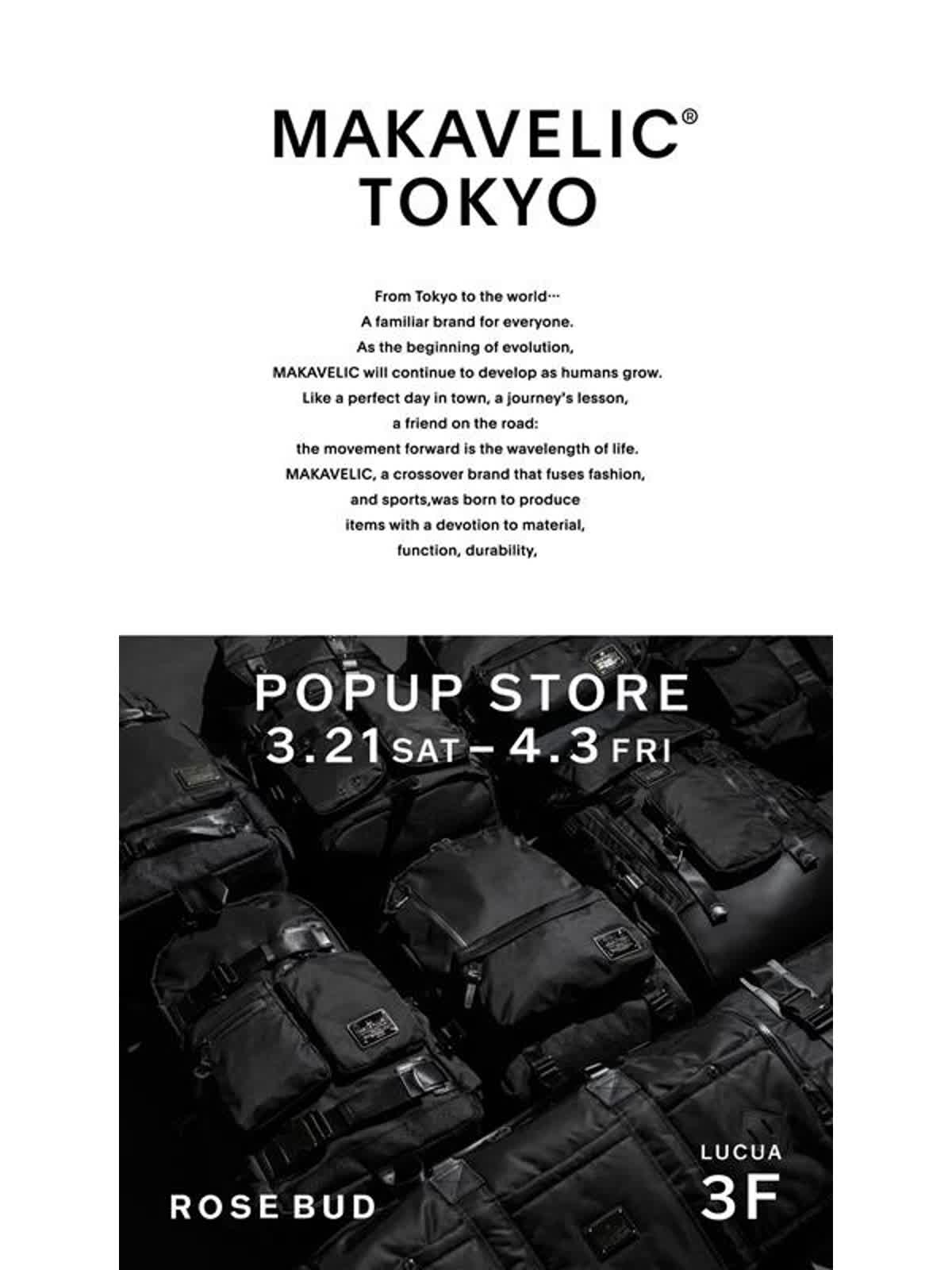 ルクア 3F ローズ バッド ROSE BUDにて3月21日(土)より日本・東京発のバッグブランド「MAKAVELIC®」のPOP UPを開催。 ファッション、ハイストリート、スポーツの要素をクロスオーバーさせたデザインが特徴の上質なプロダクトに加え、別注アイテムも登場。 ショップニュース⼀覧