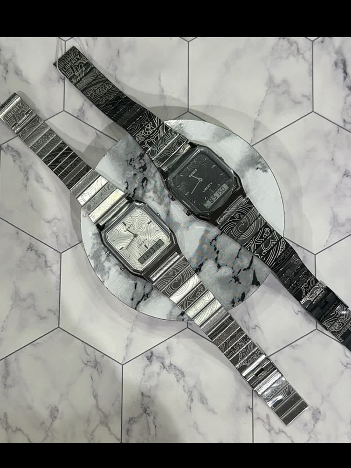 ベースモデルには角型フェイスにアナログ時計とデジタル表示を組み合わせた人気のAQ-230を採用。リバティの代表的なペイズリーファンファーレにインスパイアされ、曲線が美しいクラシックなペイズリー柄をバンドと文字板にデザインしました。 レーザー刻印によって緻密に表現された柄が、繊細な美しさを添えています。