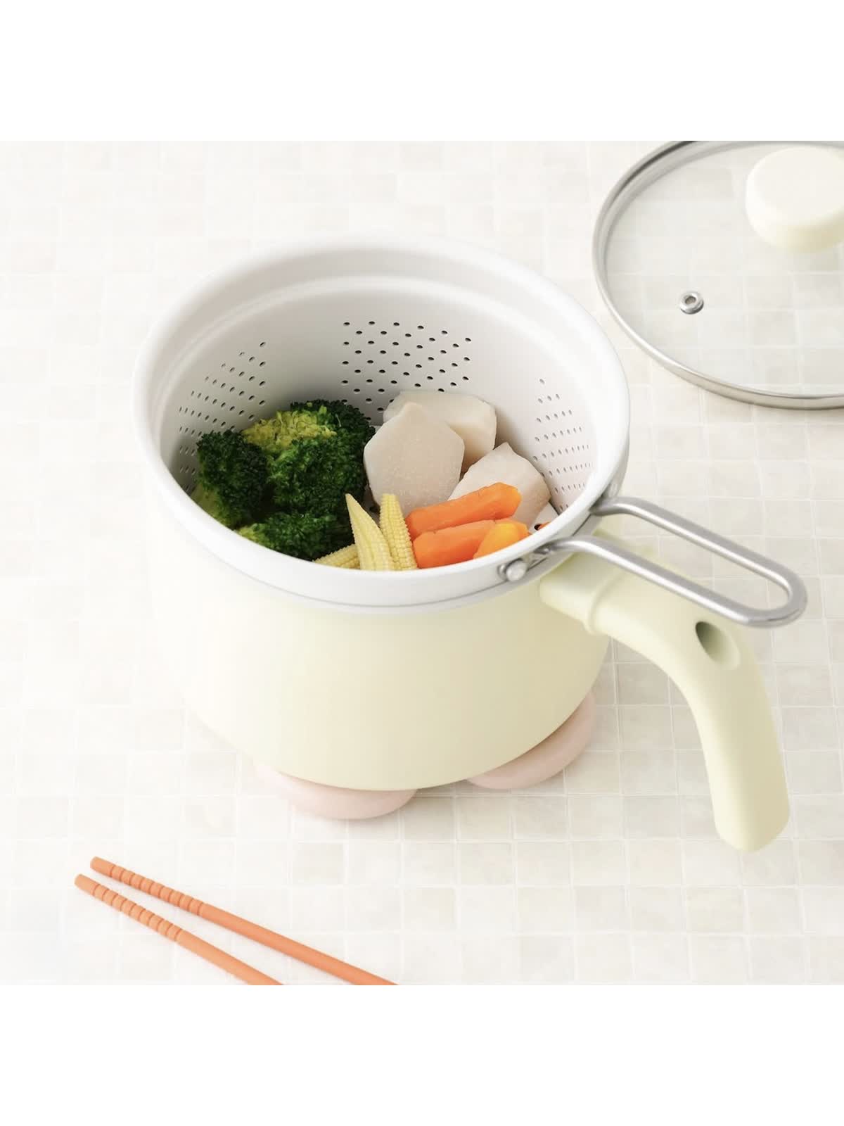 湯切りを簡単にでき麺を茹でる際に便利なストレーナーや、人気の蒸し料理にも挑戦できるスチームプレート付きで、お料理の幅がぐっと広がる便利アイテムです。