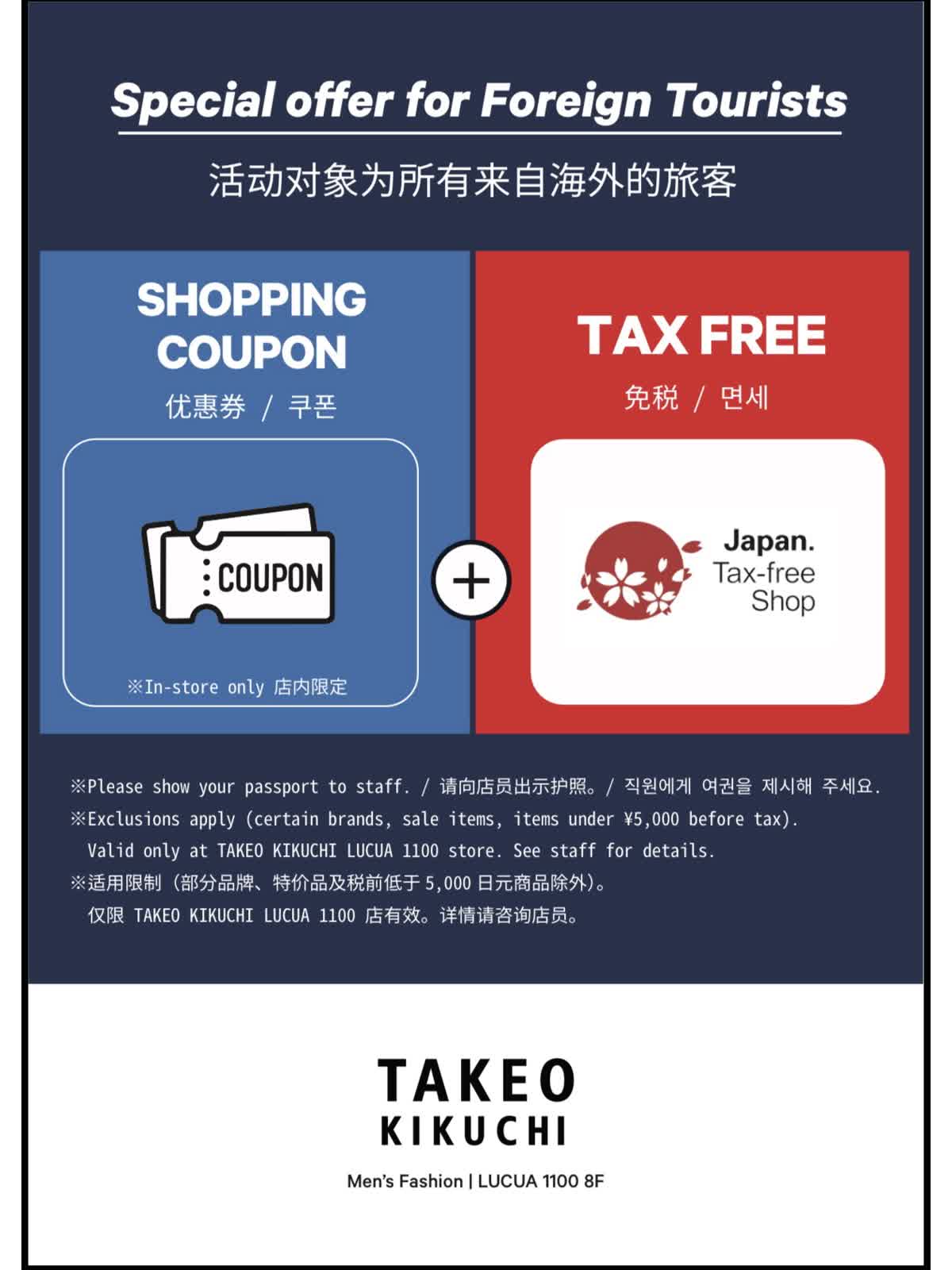 Valid only at TAKEO KIKUCHI LUCUA 1100 store. See staff for details.
