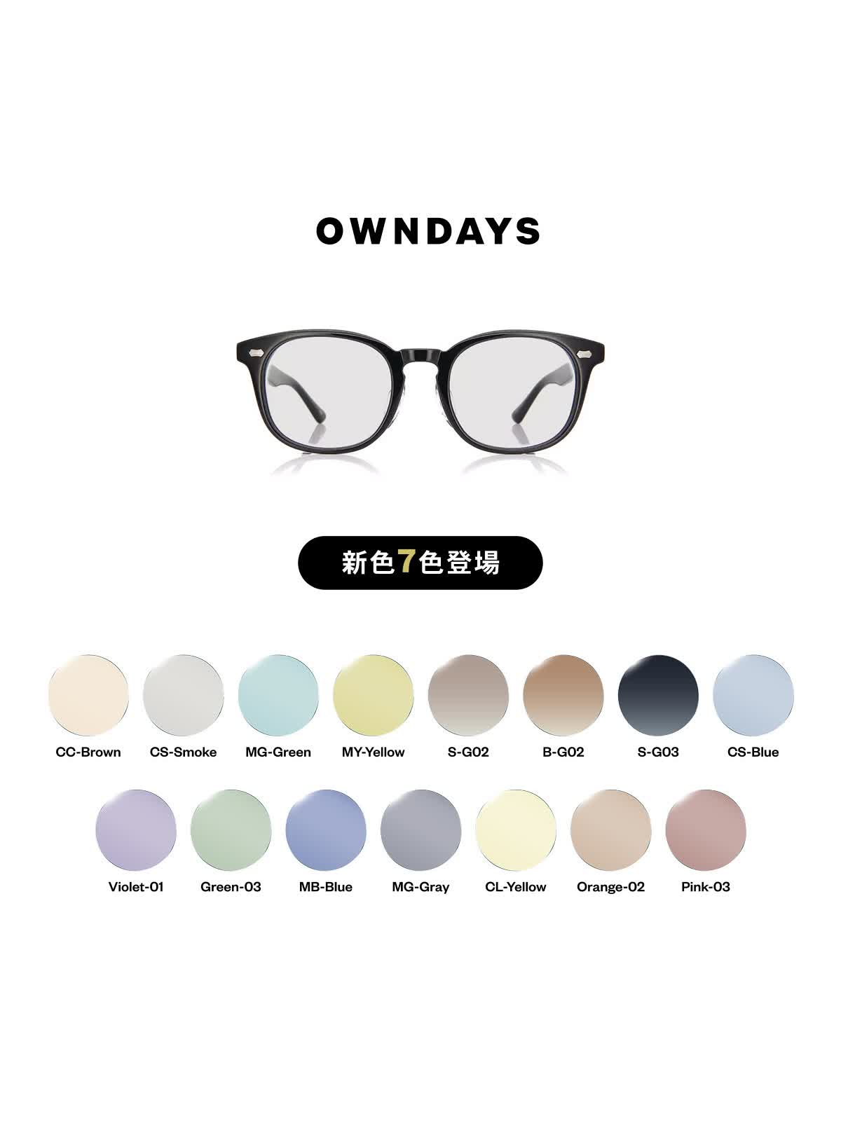 カラーレンズの新色として、CC-Brown、MY-Yellow、MG-Green、CS-Smoke、S-G02、B-G02、S-G03の新色7色を追加しました。