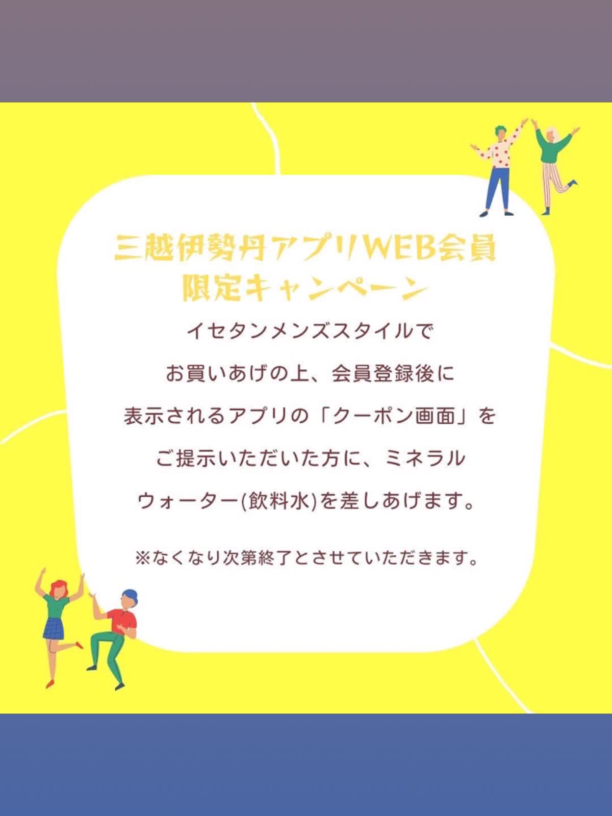 イセタンメンズスタイルでお買い上げの上、会員登録後に表示されるアプリの「クーポン画面」をご提示いただいた方に、ミネラルウォーター(飲料水)を差し上げます!