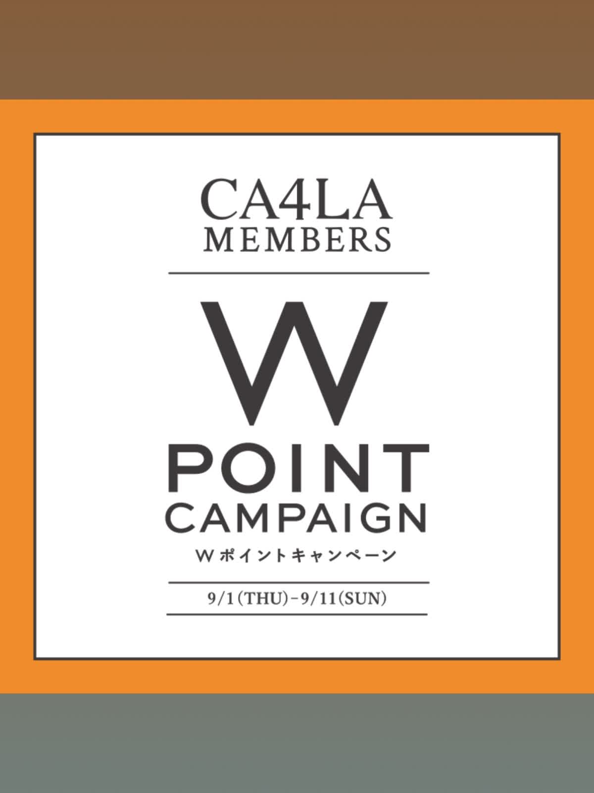 CA4LA MEMBERS会員の皆様への感謝の気持ちを込めまして、Wポイントキャンペーンを開催いたします。9/1(木)〜9/11(日)期間中のお買い物で差しあげるポイントが通常の2倍に!新規ご入会の方もキャンペーンの対象となりますので、この機会にぜひご入会ください。
