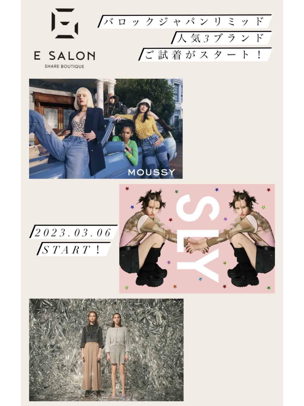 現在、E SALONフィッティングサービスとして試着可能な約40ショップに加えて、試着可能ブランドとして株式会社バロックジャパンリミテッドが展開する3ブランドーーMOUSSY、SLY、riendaが追加することとなり、E SALONで試着をお楽しみいただけるようになりました!