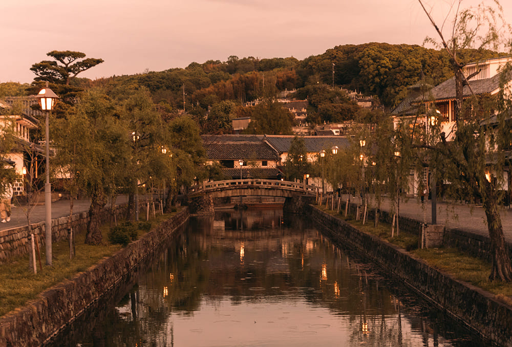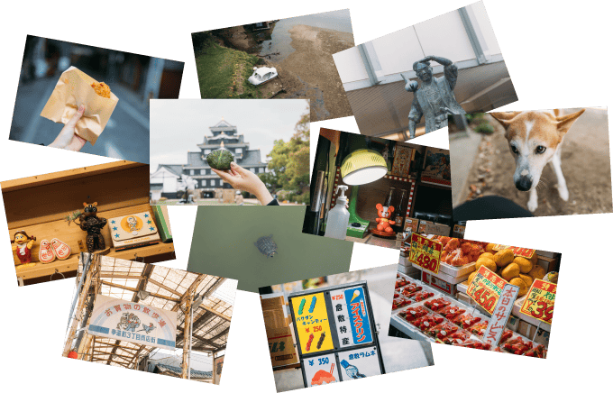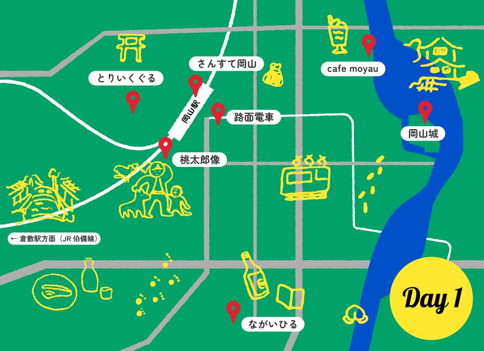 岡山駅前の桃太郎像を眺めたら、奉還町のレトロな商店街をブラ〜リ。駅でおにぎりを買い、路面電車で岡山城へ!天守閣からの眺めを楽しみつつ、ピクニックはいかが。午後は「ながいひる」で旅のお供に本を選び、「cafe moyau」でホッと一息。夕方からは倉敷へ、きれいな夕景と美味しい料理で一日を締めくくる。