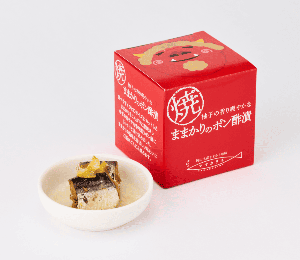 桃太郎とシリーズで買い揃えたくなっちゃう可愛さがずるいよ〜!こちらも食べやすいサイズにカットしたままかりを香ばしく焼き上げました。ポン酢のやさしい酸味と柚子の香りが、骨まで柔らかいままかりを爽やかに包み込んで、上品なお味。一口食べたら、そりゃあ鬼もニコニコせざるをえないね。