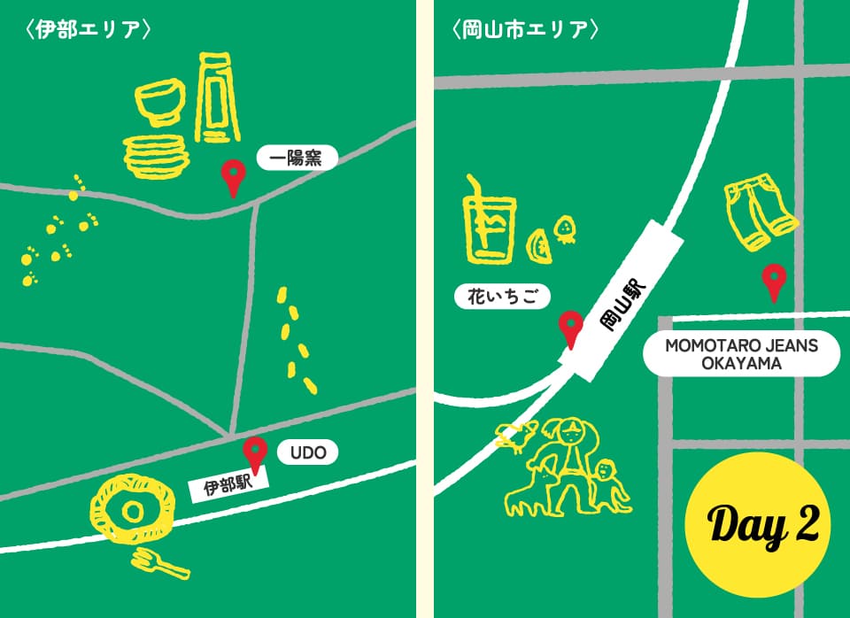 奉還町でモーニングを食べたら、電車に揺られて伊部へ。散策しつつ、煙突の数を数えてみたり。歩き疲れたらナポリタンとコーヒーで休憩。これだ!という備前焼を買って岡山へ戻ったら、思い切ってMOMOTARO JEANSを試着。なんだか買い物しちゃったな〜なんて思いながら、ミックスジュース片手に新幹線で大阪へ帰ろう。