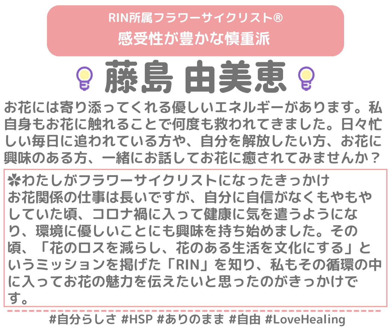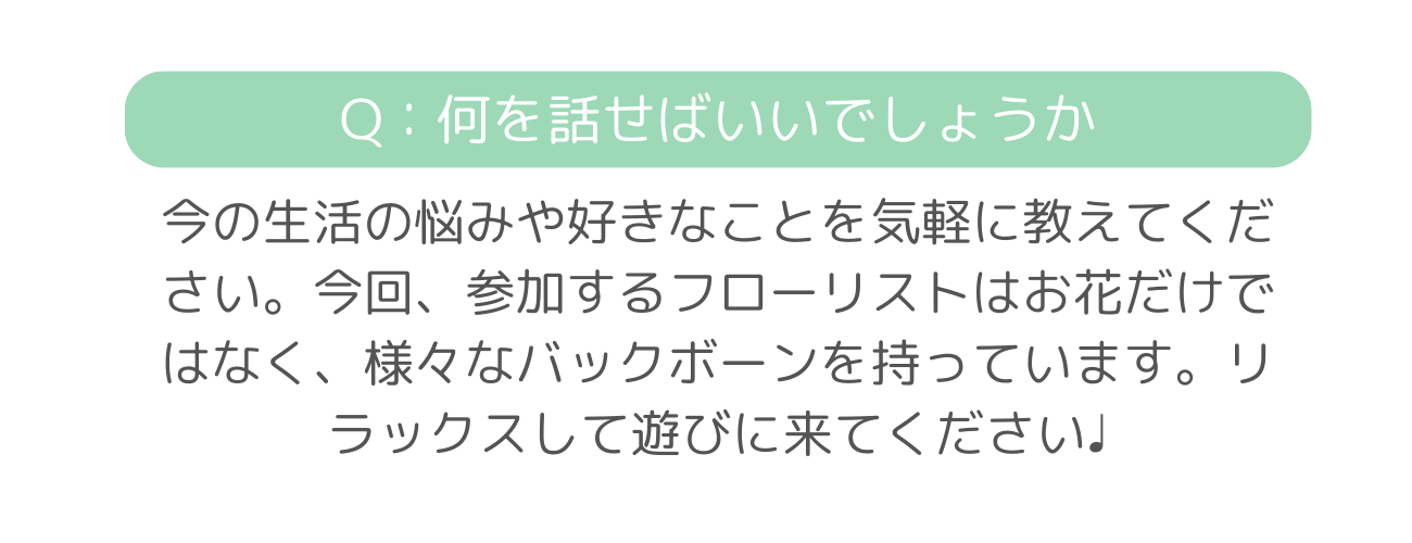 簡単な7個の質問にお答えいただき、それをもとにお話をしながら、あなた自身やあなたが想いを寄せる人のイメージにぴったりな花束をつくるお店です。