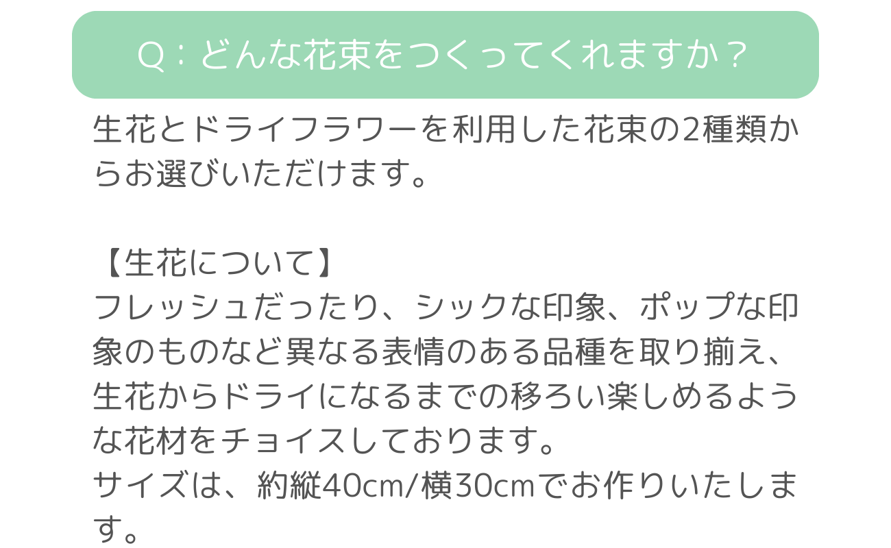 花束は、生花とドライフラワーどちらかからお選びいただくことができます。