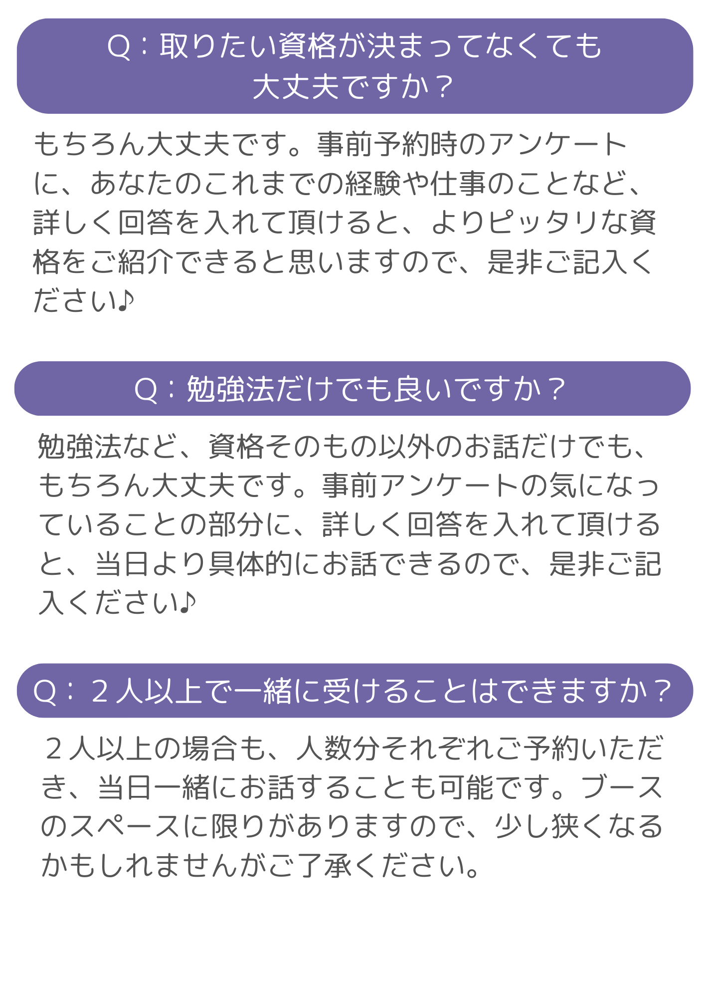事前予約いただく際にお答えいただいたアンケートの内容をもとに、当日資格紹介する人の中から1名が担当させていただきます。