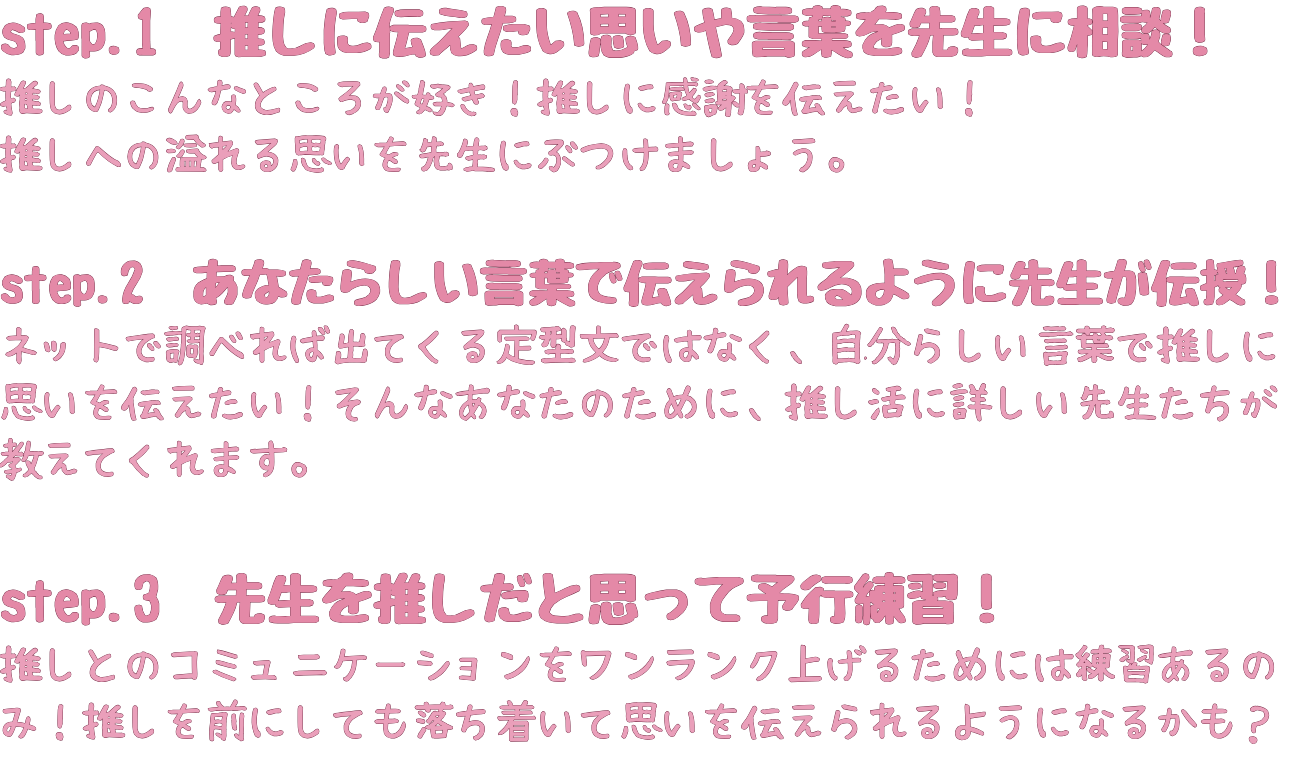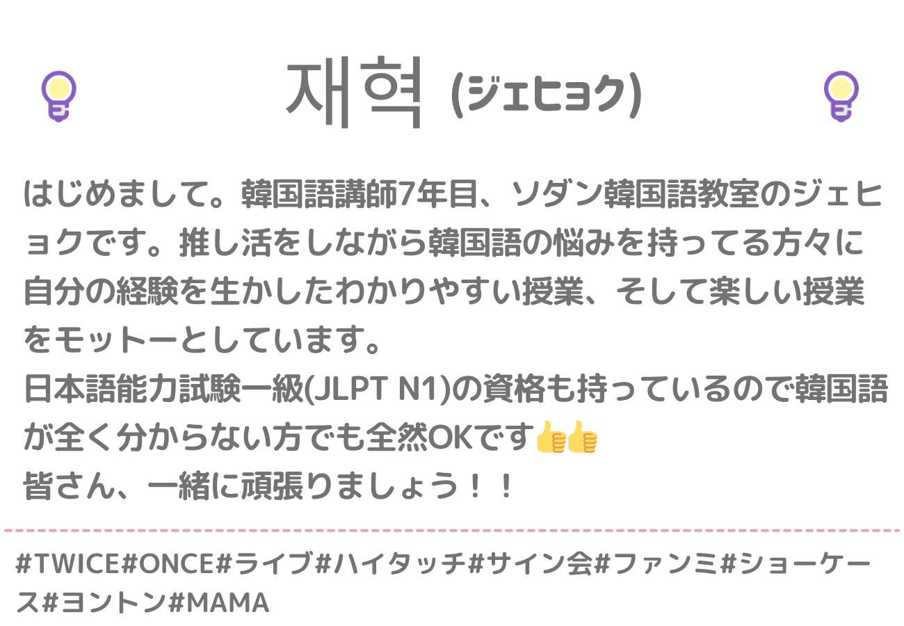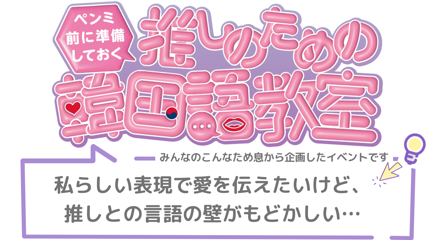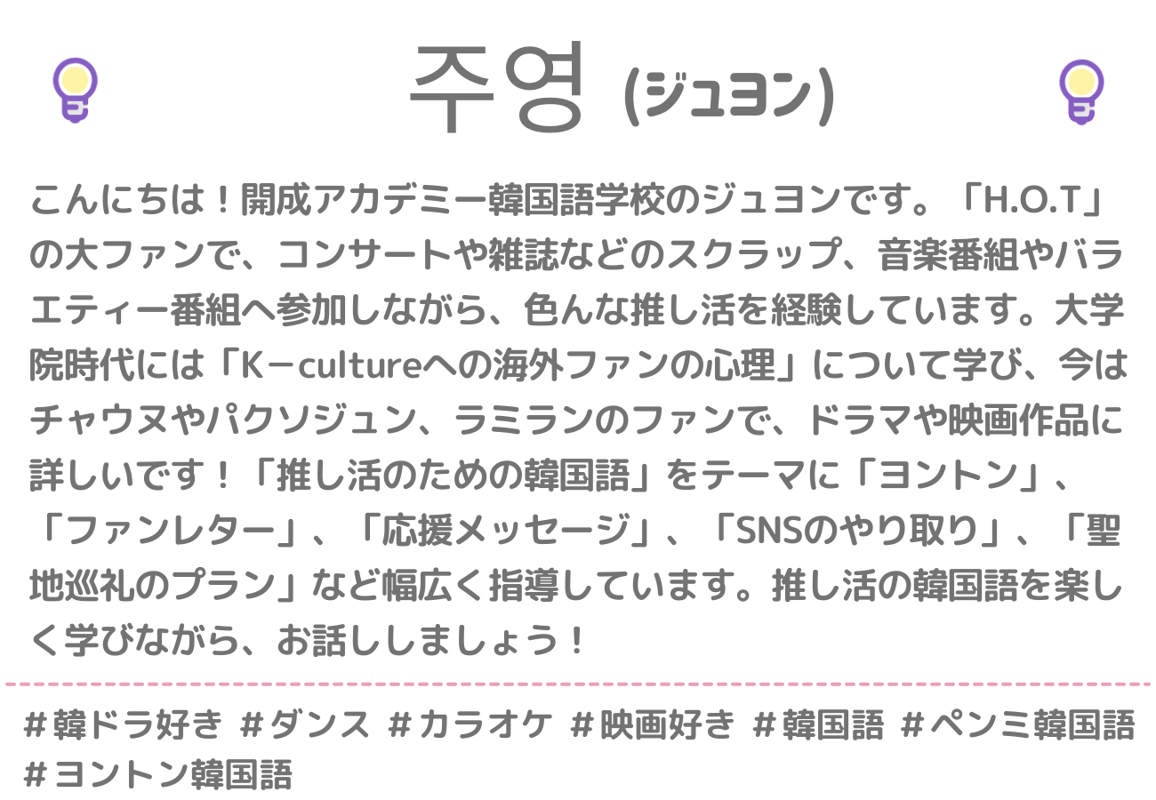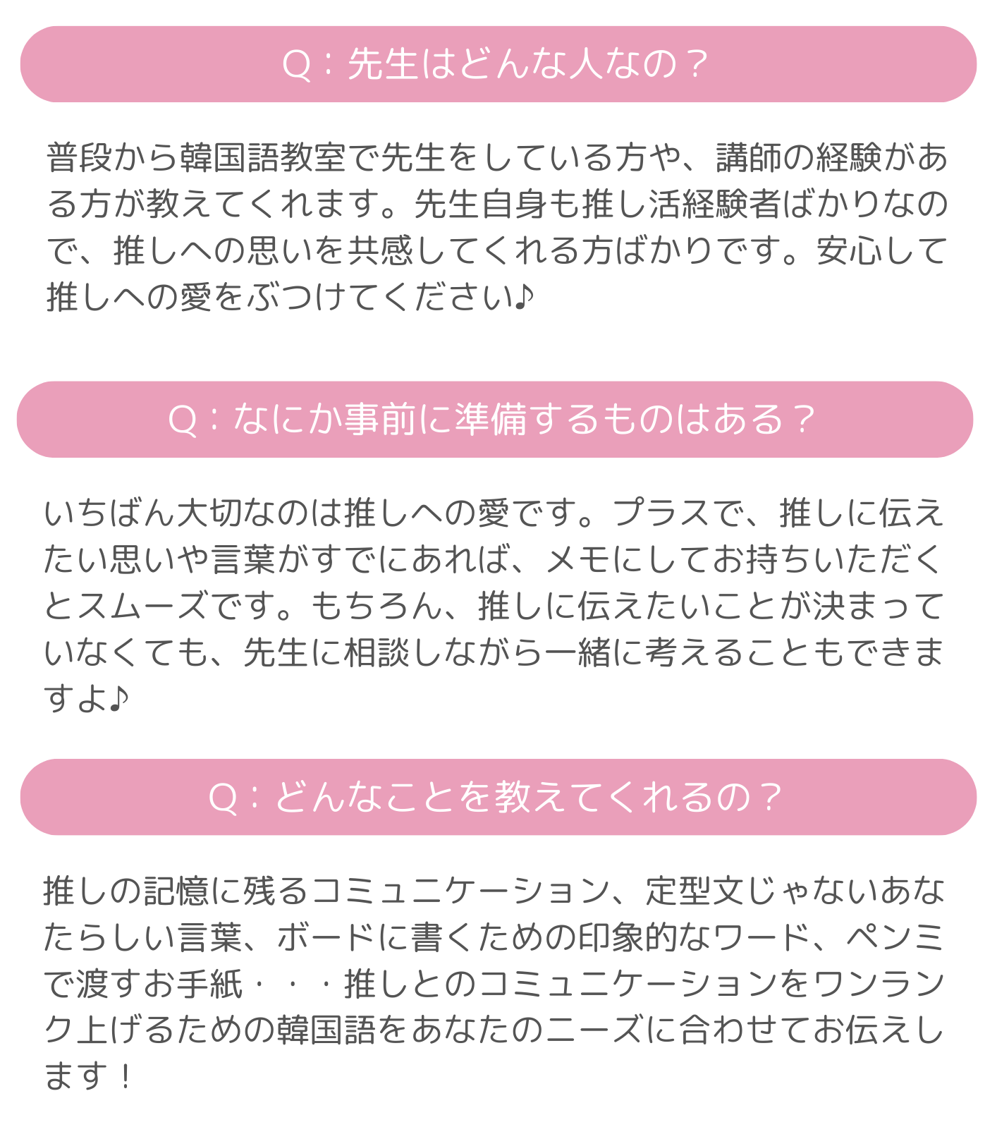 推しと会えるイベントで、うまく話せるか不安だったり、言語の壁を感じているあなたへ向けて、短い時間の中で、印象に残るコミュニケーションや、ヨントンで使うボードの言葉、ペンミで渡す手紙、推しへの愛を自然な韓国語で喋れるように練習したい!など、あなたの悩みにあわせて、推しとのコミュニケーションをワンランク上げるお手伝いをさせていただきます。