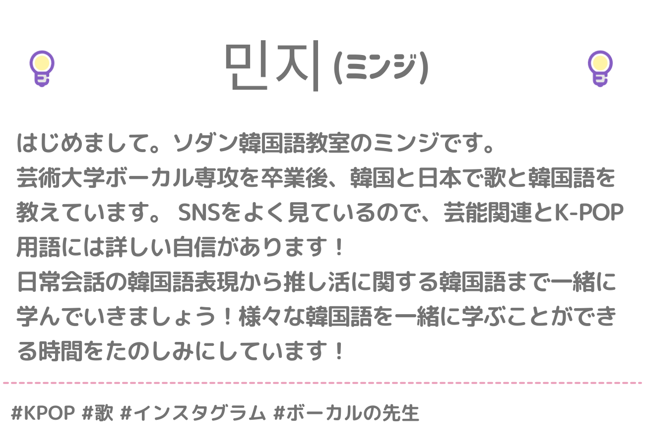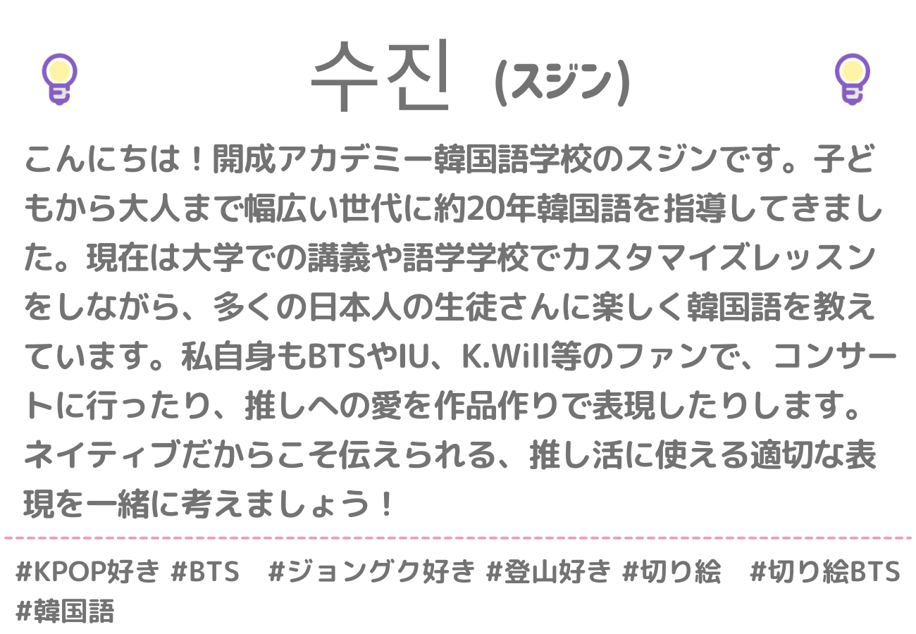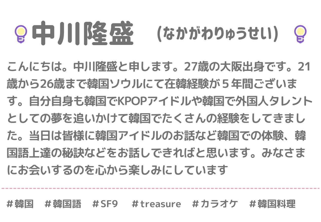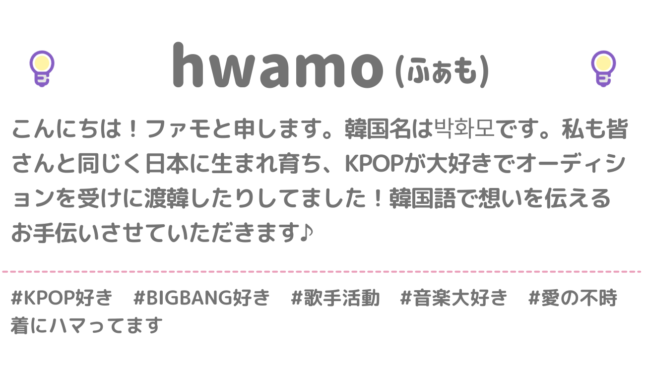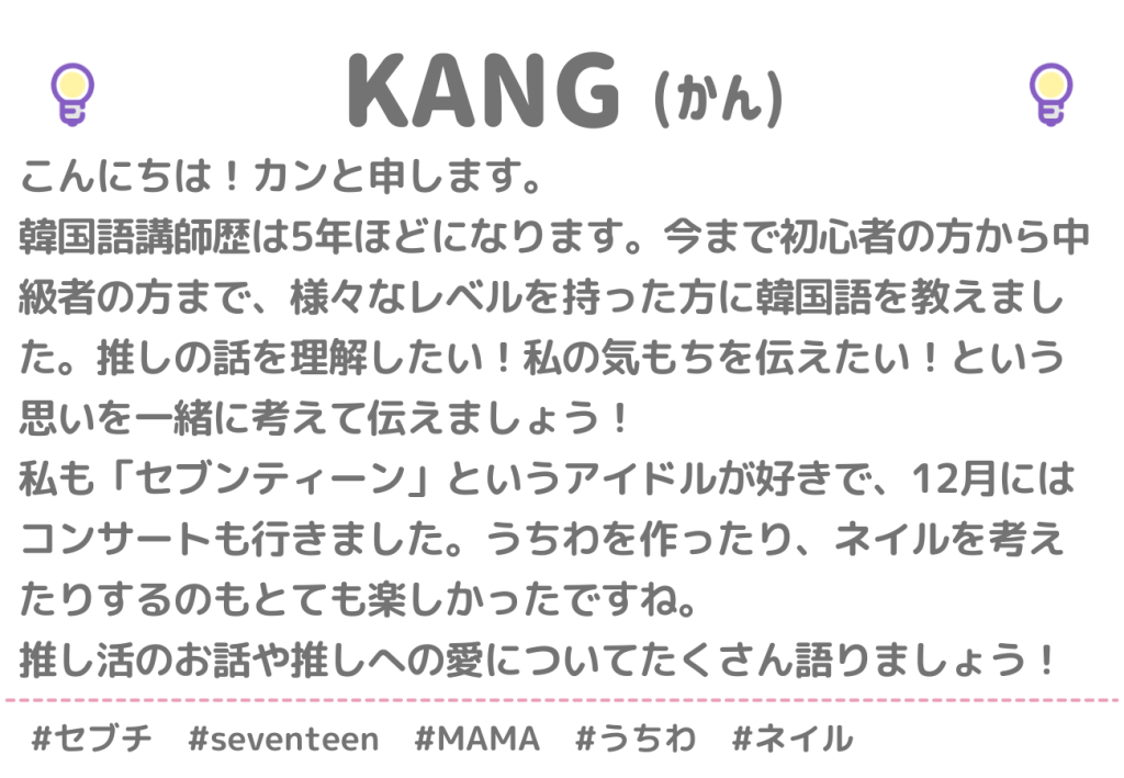 推しと会えるイベントで、うまく話せるか不安だったり、言語の壁を感じているあなたへ向けて、短い時間の中で、印象に残るコミュニケーションや、ヨントンで使うボードの言葉、ペンミで渡す手紙、推しへの愛を自然な韓国語で喋れるように練習したい!など、あなたの悩みにあわせて、推しとのコミュニケーションをワンランク上げるお手伝いをさせていただきます。