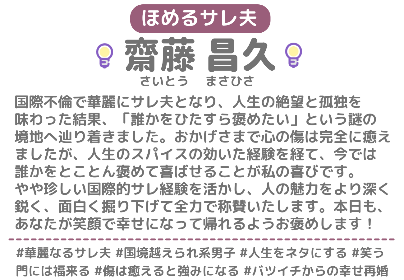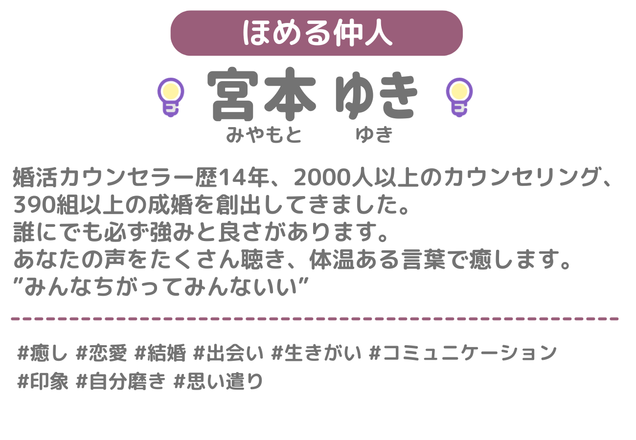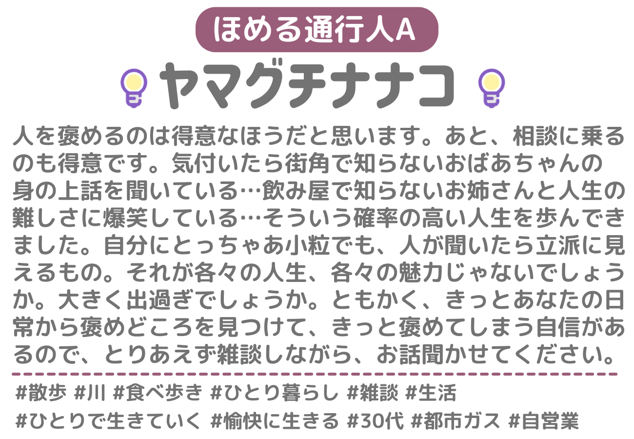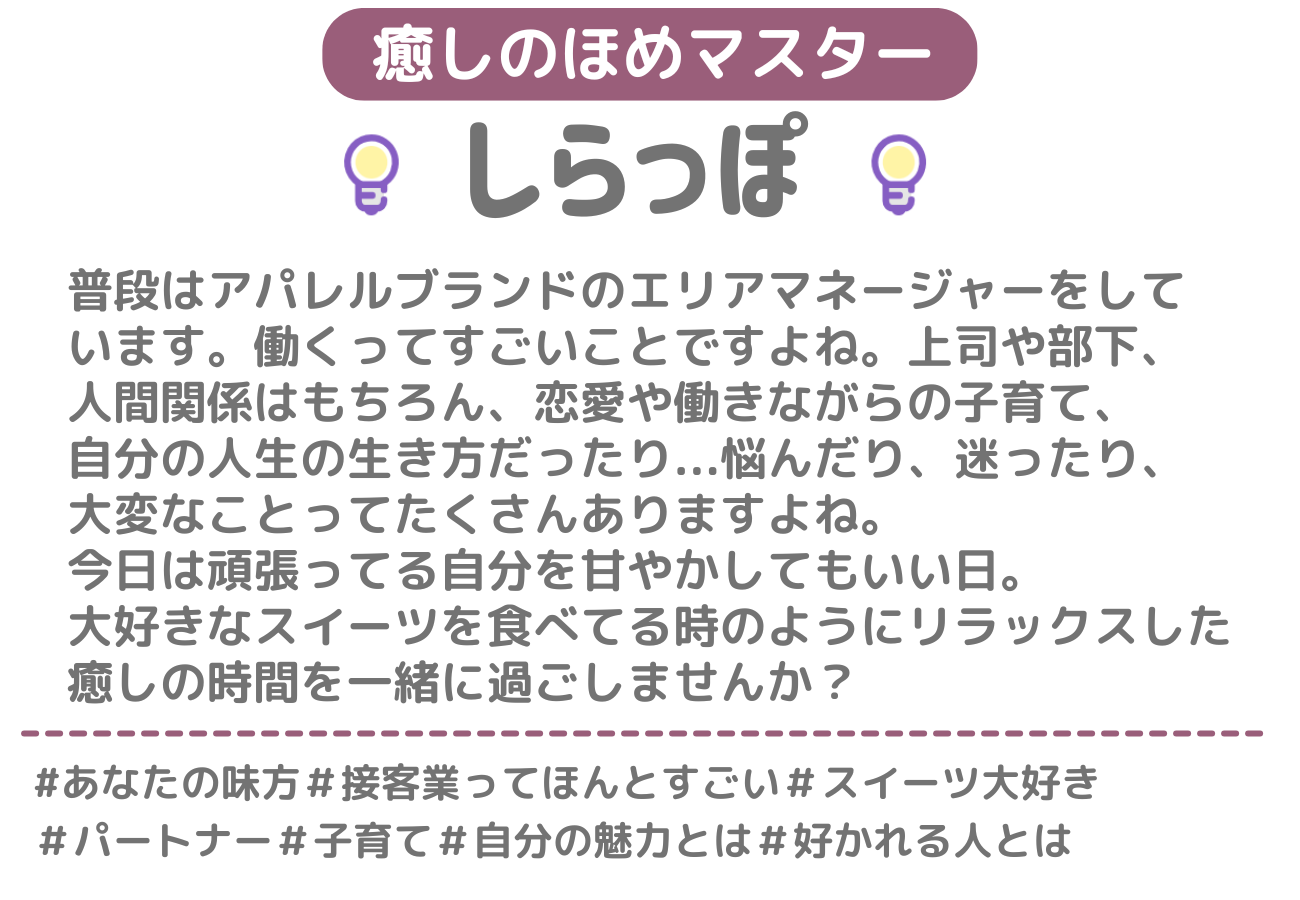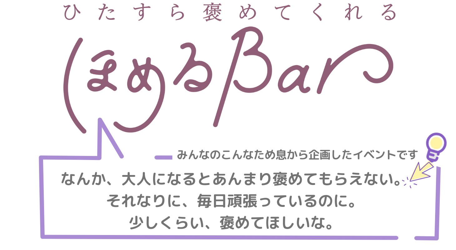 あなたの素敵だなと思ったところを、素直に褒めさせていただくお店です。「ほめる人」の中から1名を選んでご予約いただきます。当日は、その人があなたのお話しを聞きながら、褒めさせていただきます。何を話していいのか分からなくても大丈夫。まずは「ほめる人」との会話を楽しんでみてくださいね。