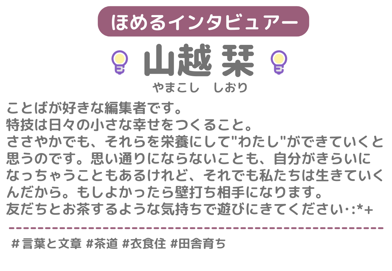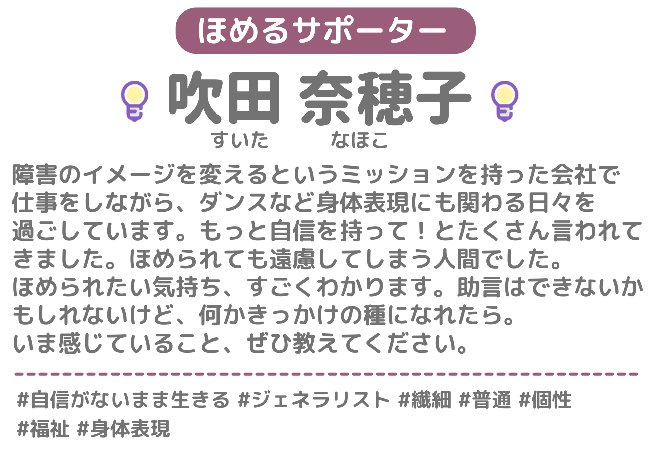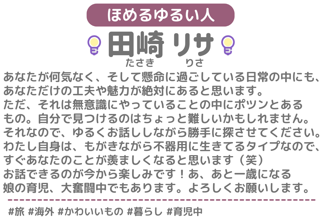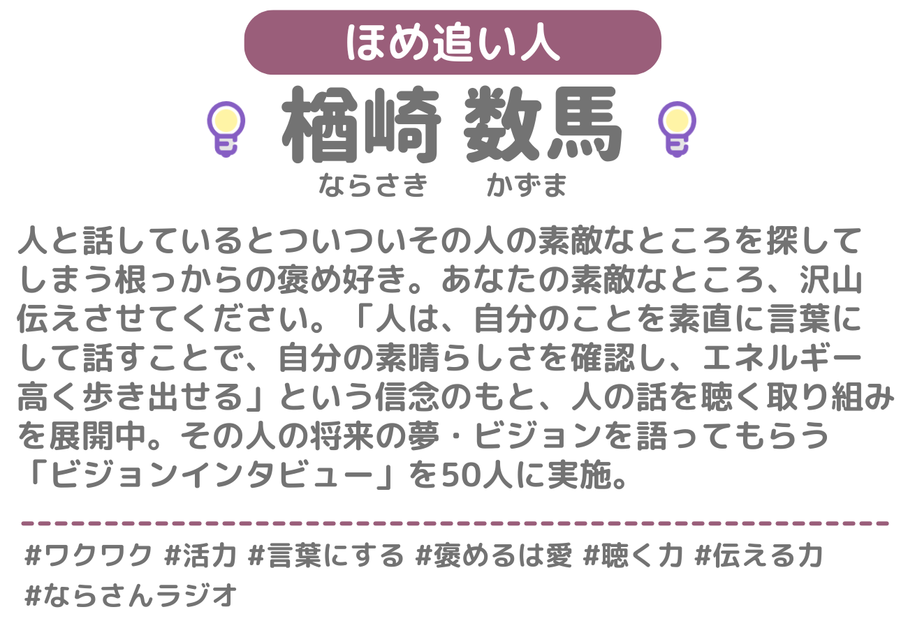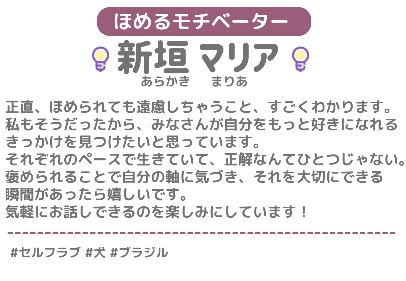 あなたの素敵だなと思ったところを、素直に褒めさせていただくお店です。「ほめる人」の中から1名を選んでご予約いただきます。当日は、その人があなたのお話しを聞きながら、褒めさせていただきます。何を話していいのか分からなくても大丈夫。まずは「ほめる人」との会話を楽しんでみてくださいね。
