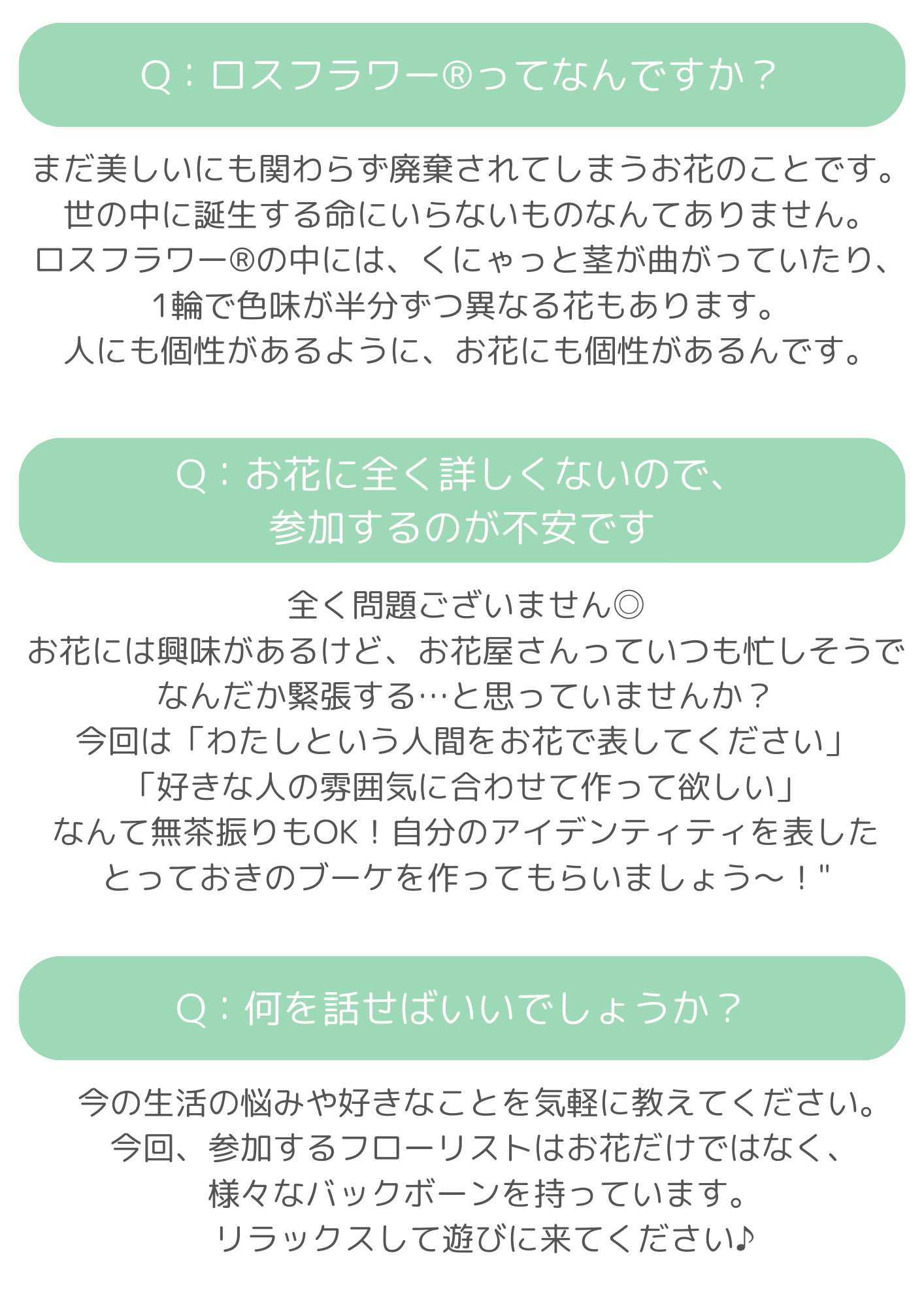 簡単な7個の質問にお答えいただき、それをもとにお話をしながら、あなた自身やあなたが想いを寄せる人のイメージにぴったりな花束をつくるお店です。