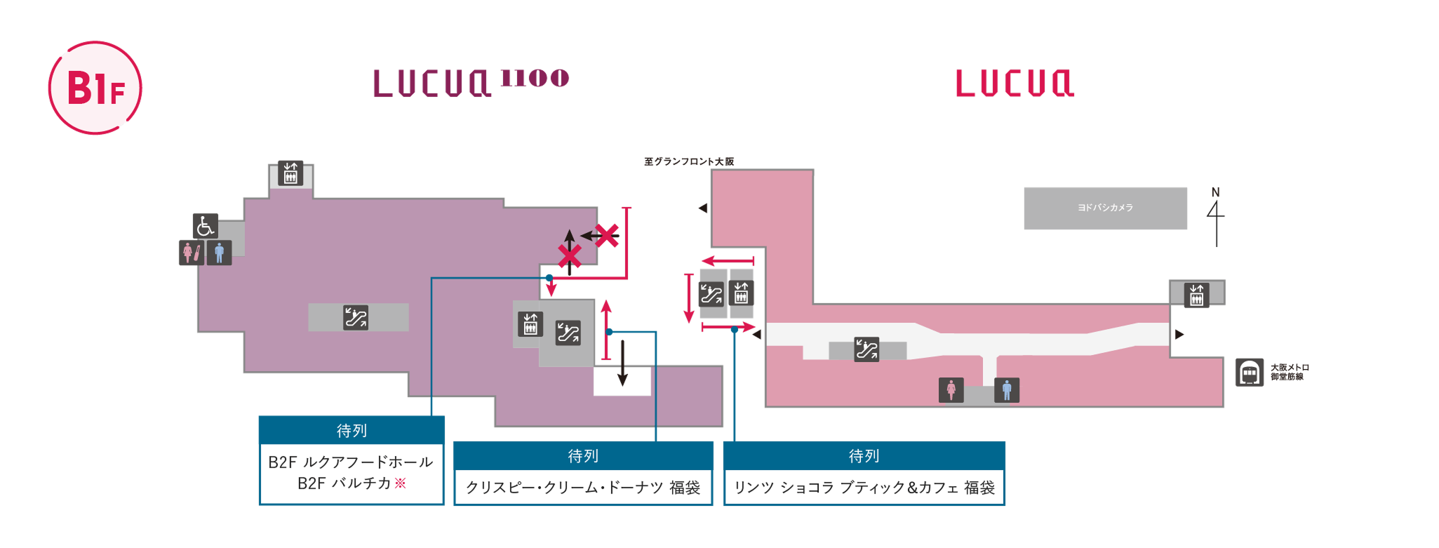 ※11:00開店のB2Fルクアフードホール、バルチカへの入館待列はB1Fです。(B2Fにはお並びいただけません)