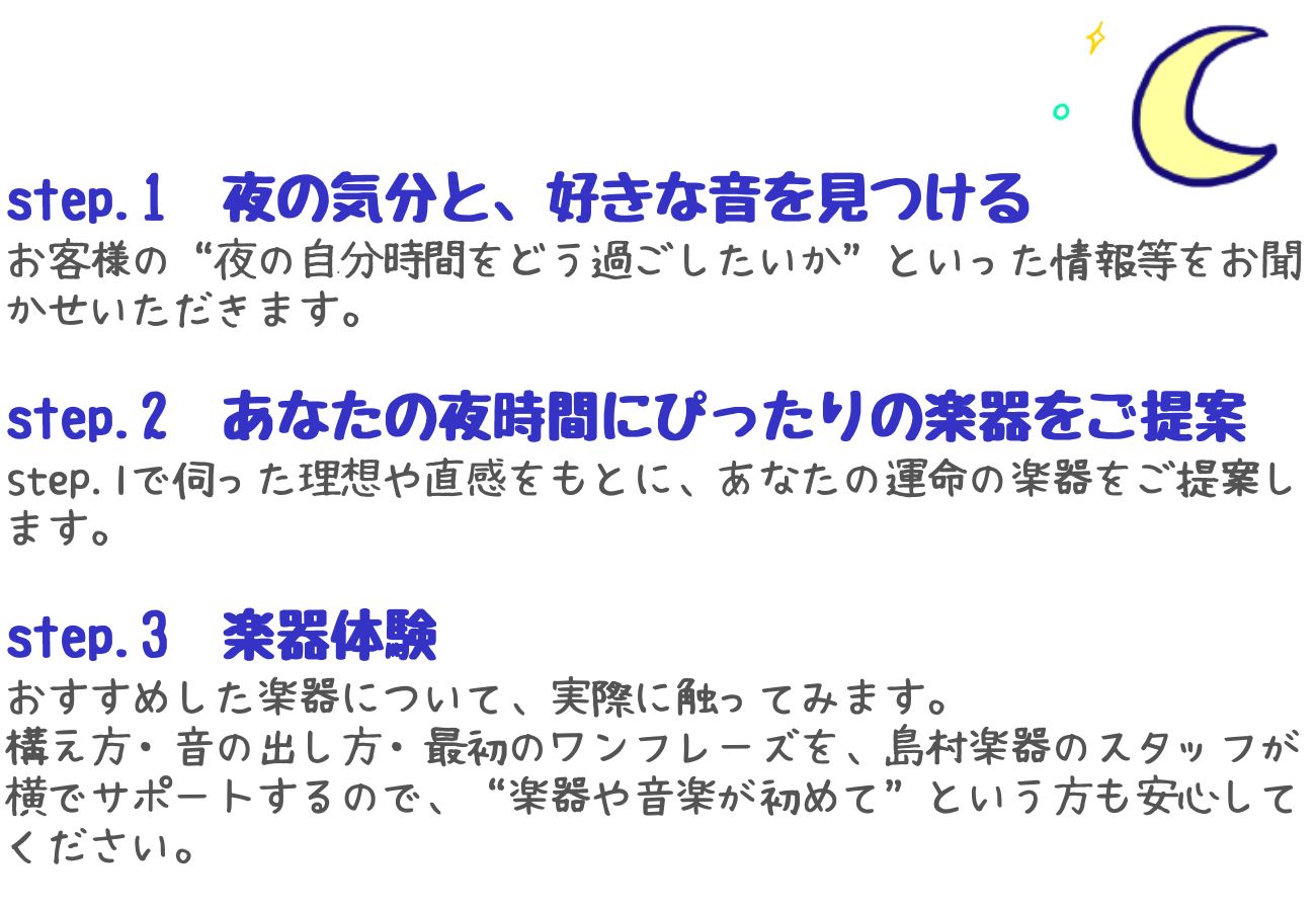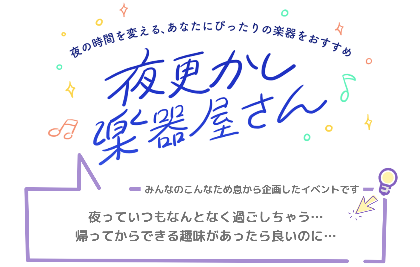 夜の自分時間にぴったりの楽器を見つけられるショップです。予約時の情報をもとに、島村楽器のスタッフが、あなたの“夜の過ごし方”にぴったりの楽器をその場でおすすめします。会場では、ギター・ピアノ・ドラム、エアロフォンなど、すべてヘッドホンで静かに楽しめる楽器をご用意。選んだ楽器は、スタッフのサポートのもと、その場で実際に演奏体験していただけます。「ストレス発散したい」「リラックスしたい」など、目的に合わせて夜の時間を豊かにしてくれる楽器をご提案します。